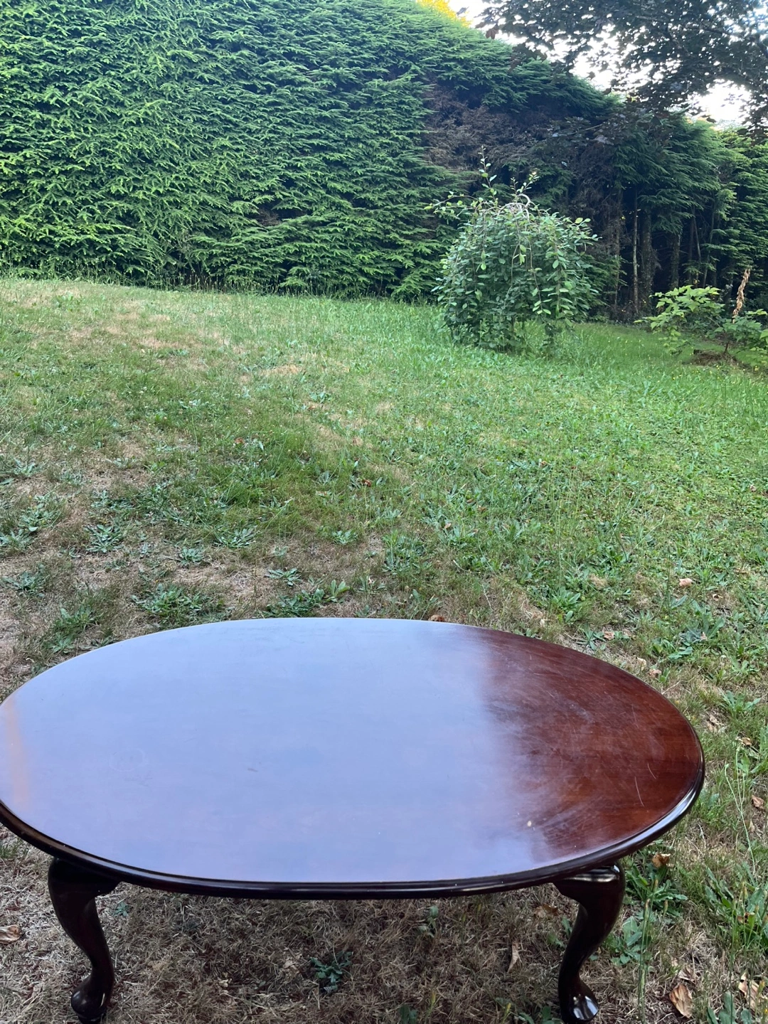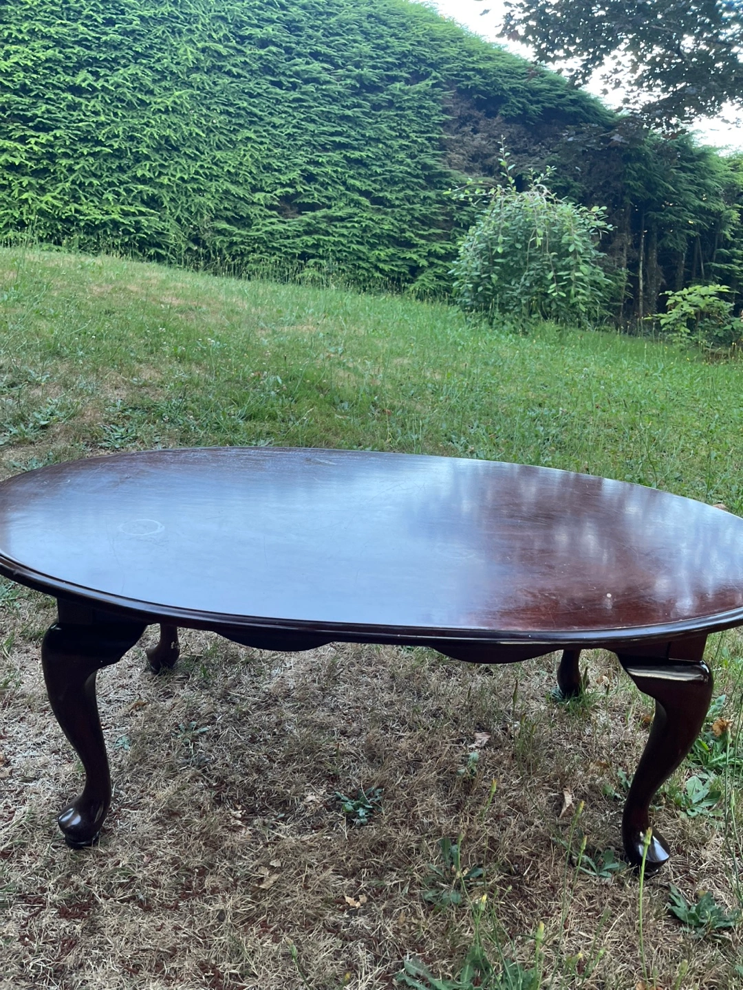 Selling a lovely oval-shaped wooden coffee table. It's a nice piece to add to your living room. The table is in good condition and has a classic design with elegantly curved legs