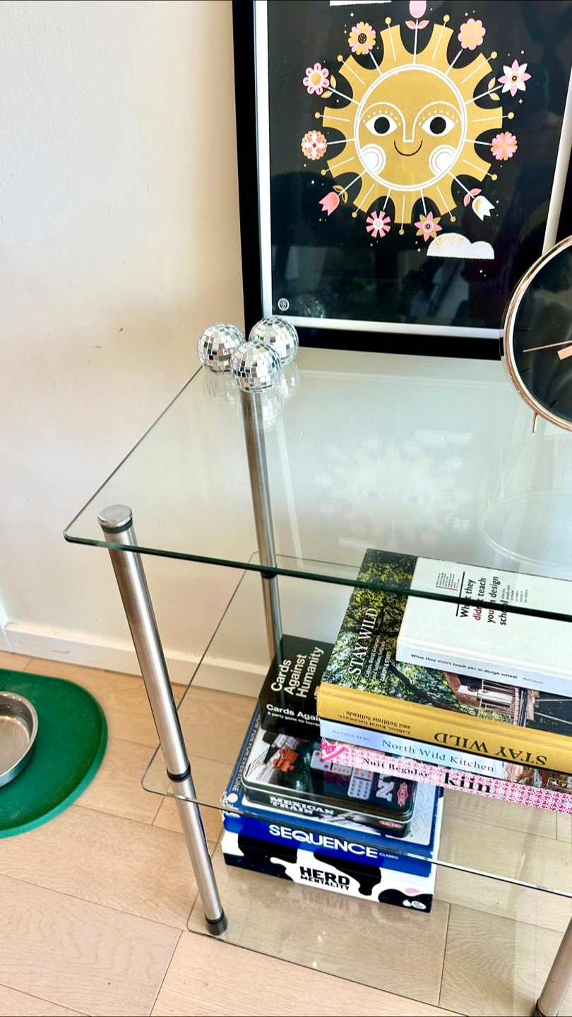 Vintage post modern look, chrome and glass shelf, in perfect condition. It has three tiers perfect for a record player, displaying plants or other decorative items!
