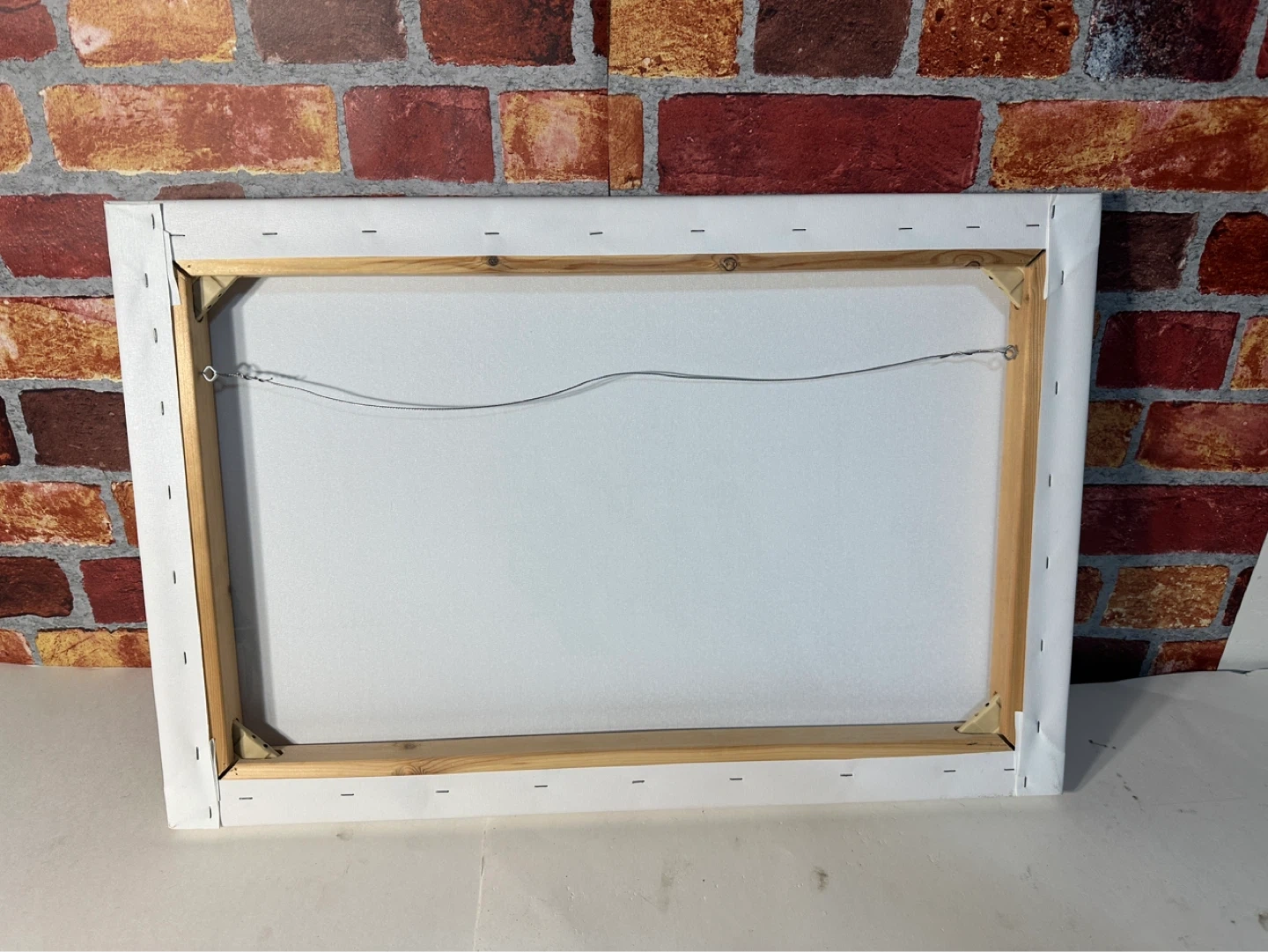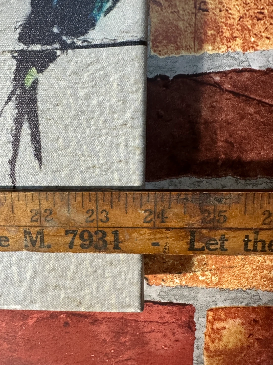 This canvas print features a Banksy-inspired design with pigeons and protest signs. It's approximately 24 inches by 16 inches. Perfect for adding a thought-provoking piece to your space!