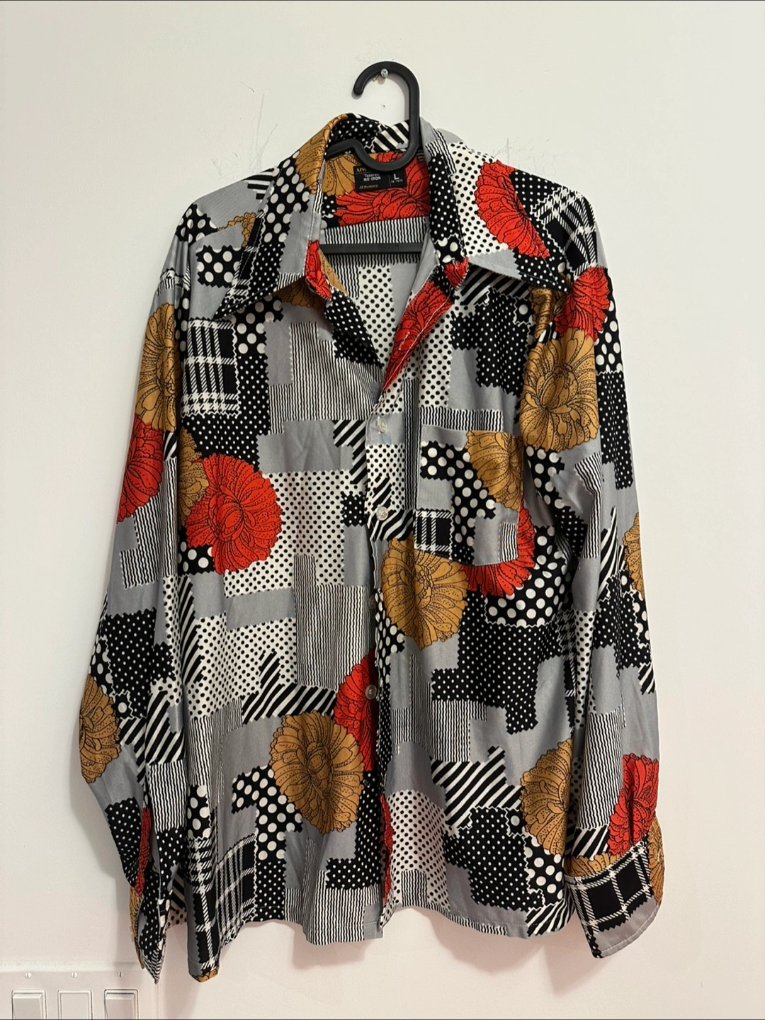 Funky Mow Mow No Show shirt, size L! It has a really cool patchwork pattern with flowers, polka dots, and stripes. Perfect for adding some flair to your wardrobe