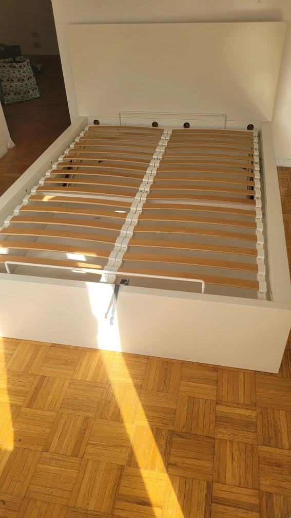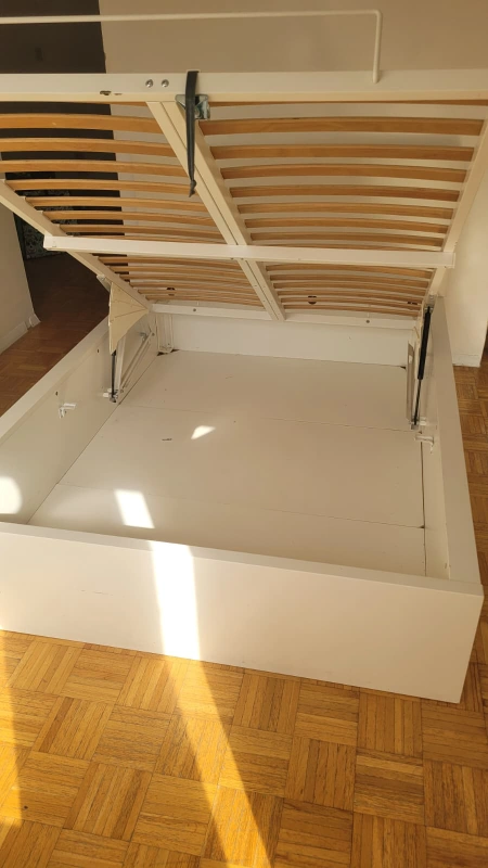 Giving a white storage bed frame. It's in good condition and offers great under-bed storage space! Perfect for keeping extra linens, clothes, or anything else you need to tuck away neatly