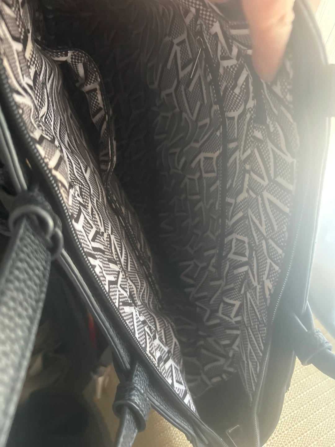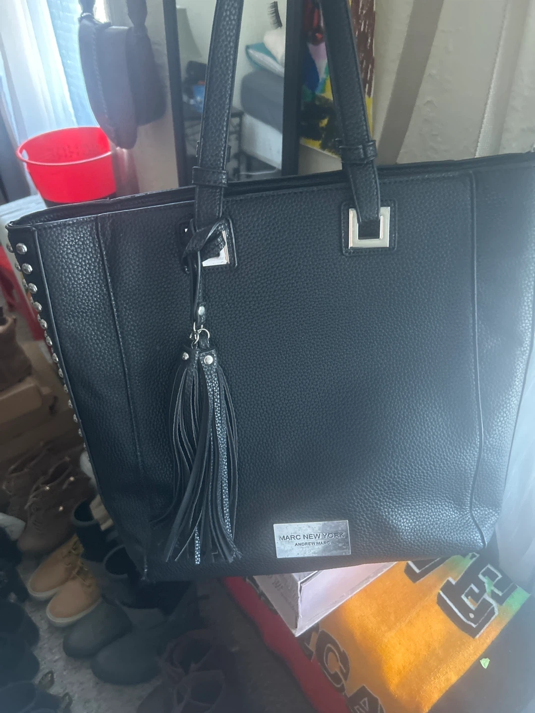 Marc New York tote bag in black faux leather. Features silver-tone stud detailing along the sides and a tassel accent. The interior has a patterned lining with pockets. This bag is spacious for everyday use!