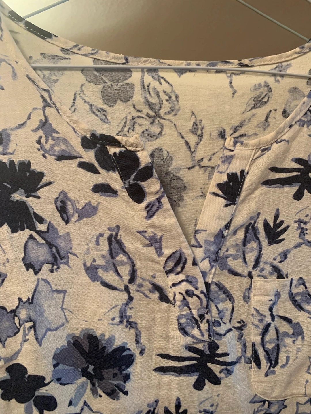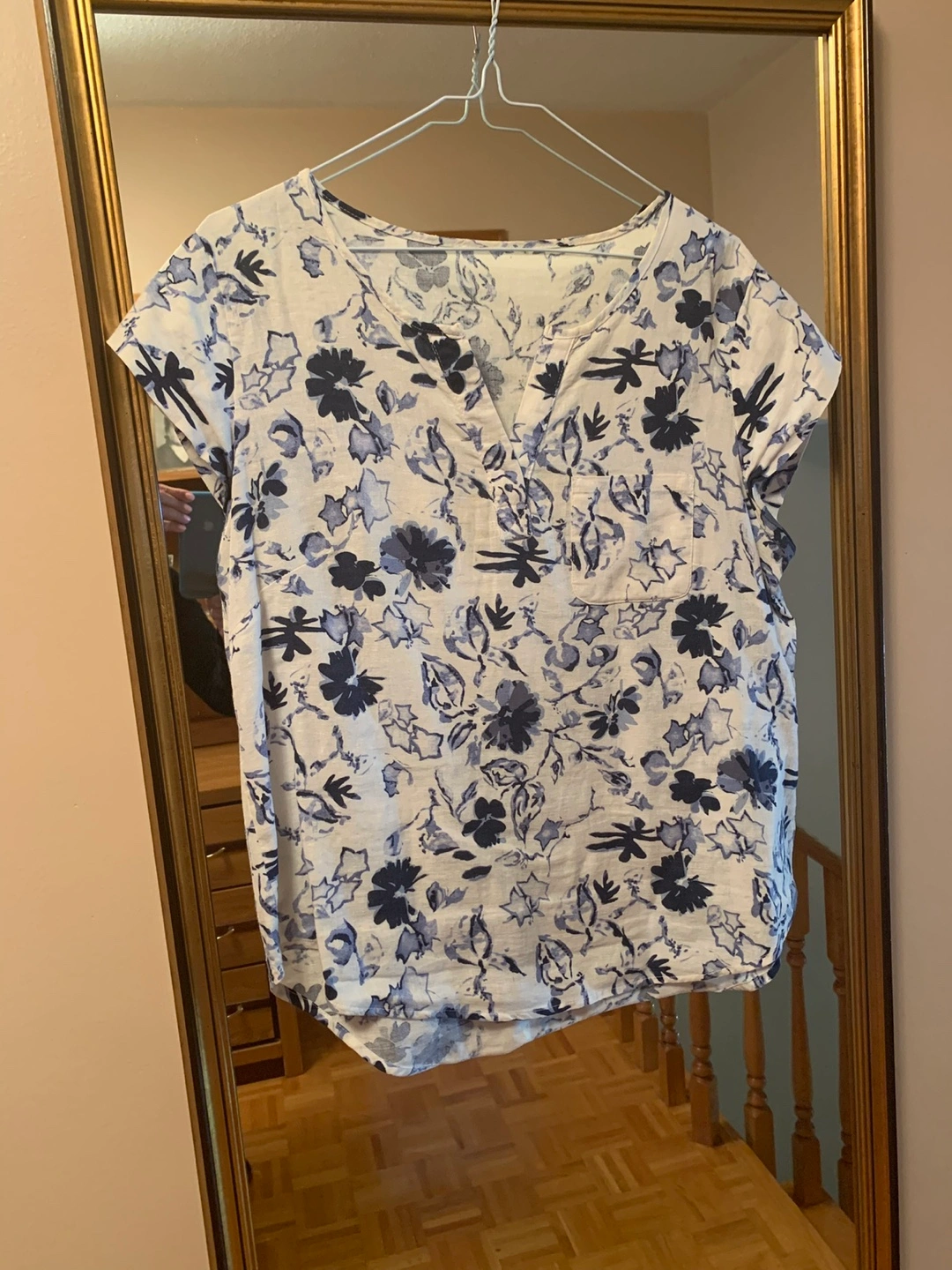 A cute floral print blouse! It features a V-neck and short sleeves. Perfect for a casual day out or dressing up for a special occasion