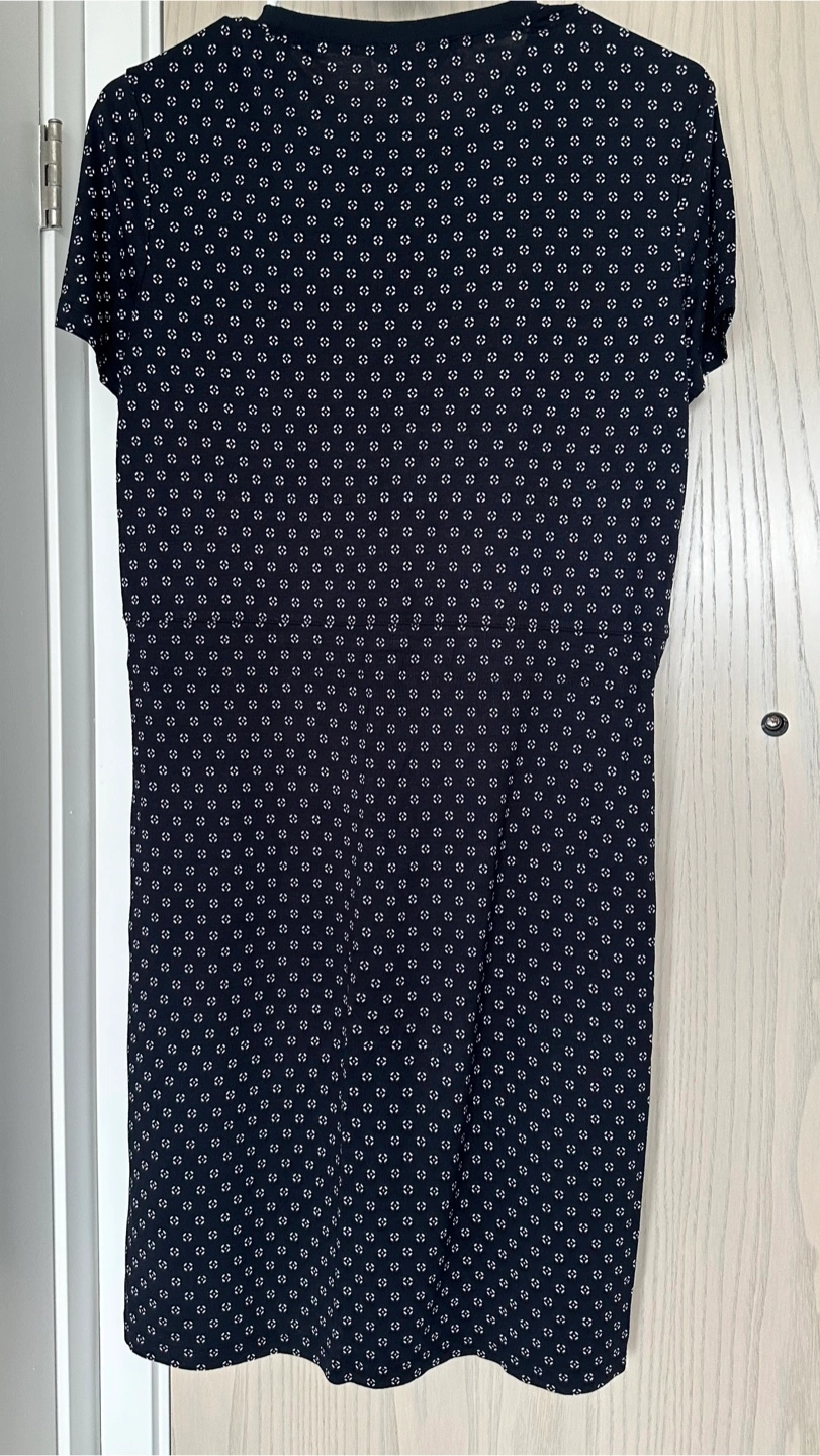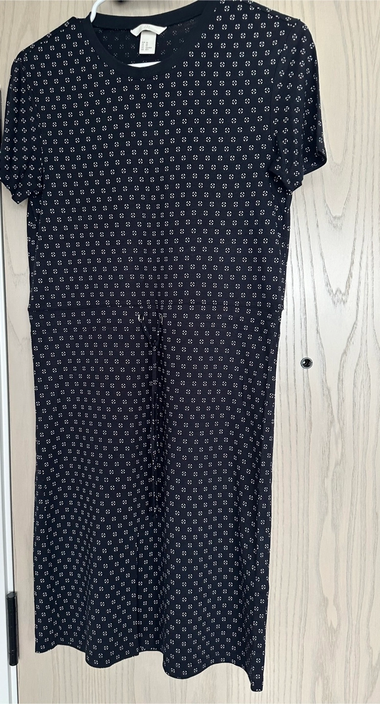 10Selling a cute H&M black t-shirt dress with a subtle white pattern. It's a size Small and in great condition! Perfect for a casual day out or dressed up with some accessories. The dress is made of a soft, comfortable material.