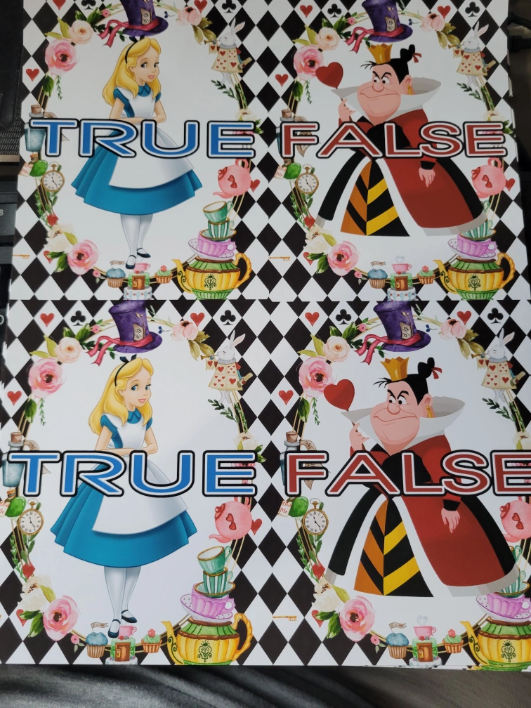 Selling an Alice in Wonderland themed true or false game! It features Alice, the Queen of Hearts, and other elements from the story. Fun for kids and fans of the classic tale!