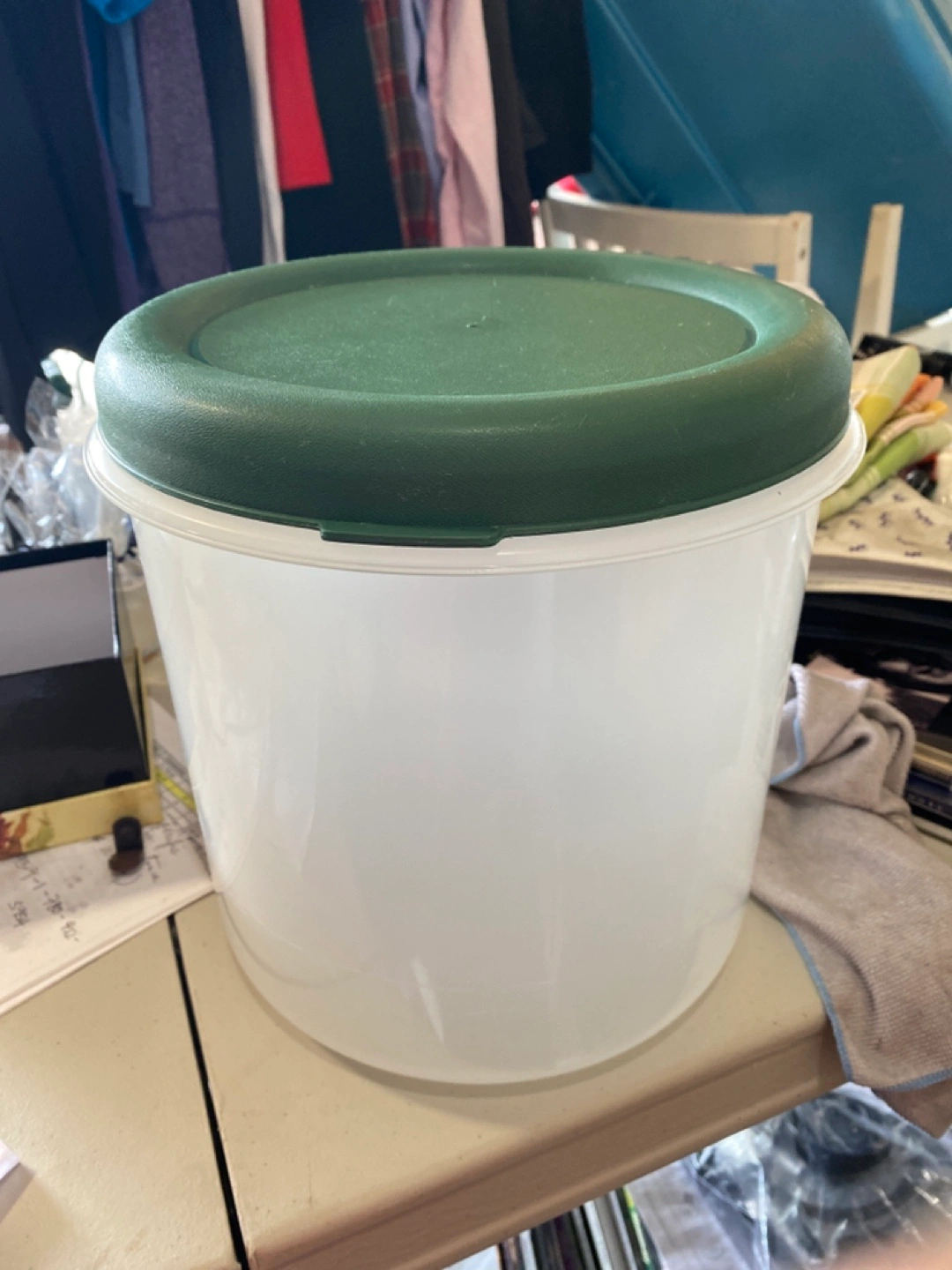 111Selling a white plastic storage container with a green lid. It's in good condition and perfect for storing various items around the house. Great for organizing!
