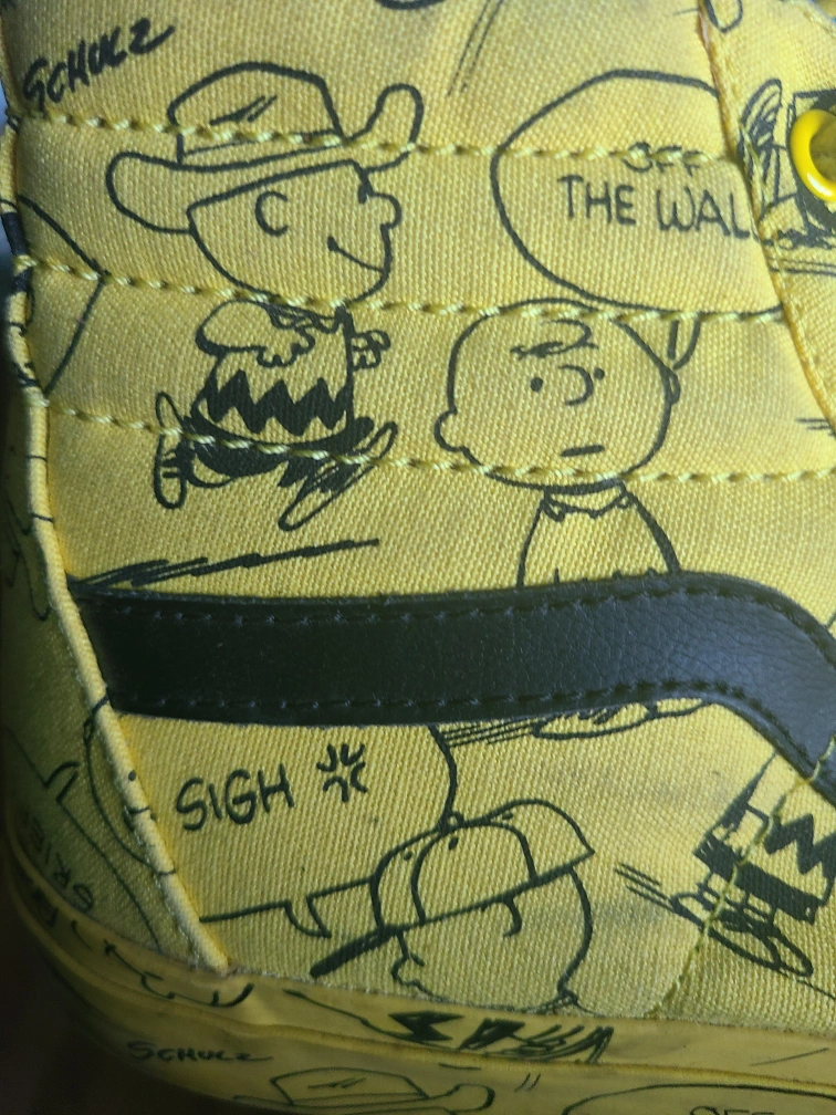 Vans and Peanuts collab! These Sk8-Hi shoes feature a fun yellow design with Snoopy and the Peanuts gang. Size is US Men's 9.5 / US Women's 11.
