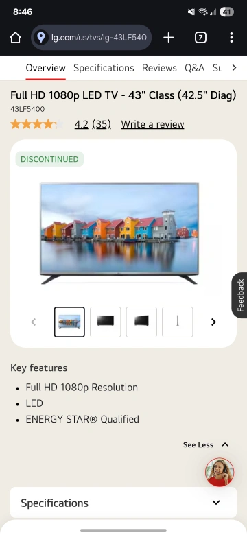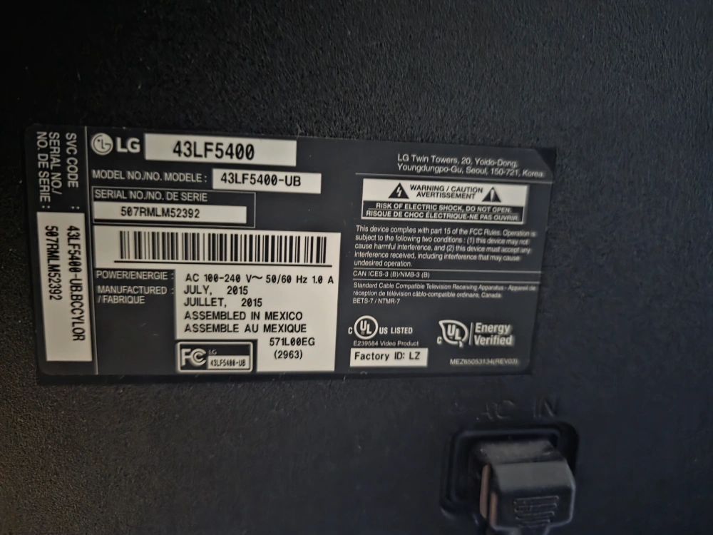 Selling an LG 43LF5400 43-inch Full HD 1080p LED TV. It's in good condition and ready for a new home! Key features include a Full HD 1080p Resolution and it's ENERGY STAR® Qualified. Not a smart tv, but do not worry I have a Roku to make it smart tv, for both it is a good deal.