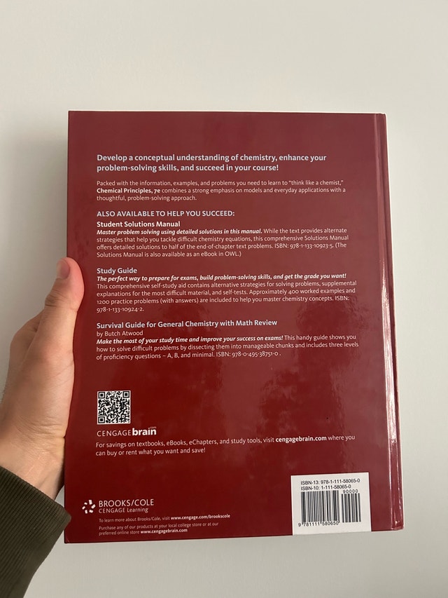 Publisher: Brooks/Cole, Cengage Learning. ISBN-13: 978-1-111-58065-0. Condition: Excellent, hardcover, clean pages, very well-kept. This textbook is a comprehensive introduction to chemistry, emphasizing conceptual understanding, problem-solving skills, and real-world applications. Perfect for university-level general chemistry courses. Also pairs well with the Student Solutions Manual (available separately — I have a copy listed too). Pickup: Mississauga or Toronto.