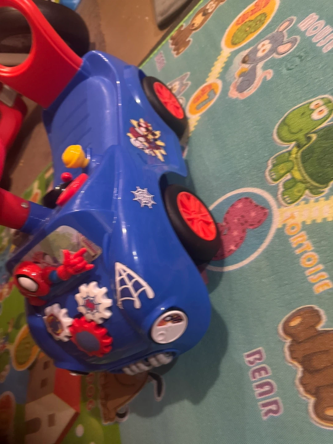 Blue ride-on toy car featuring Spider-Man graphics. It has a red steering wheel and a handle for pushing. This toy is great for little ones learning to move around!