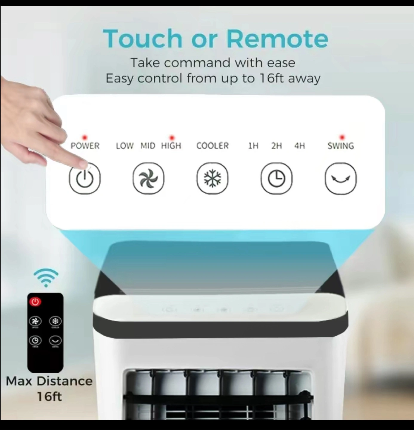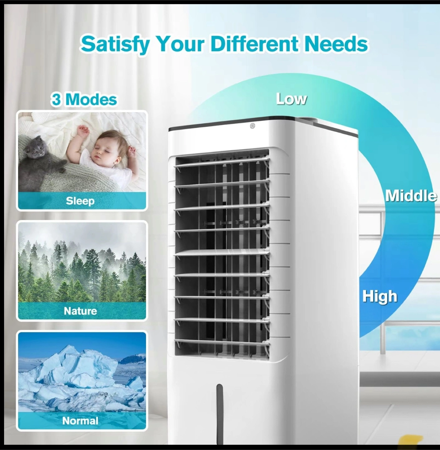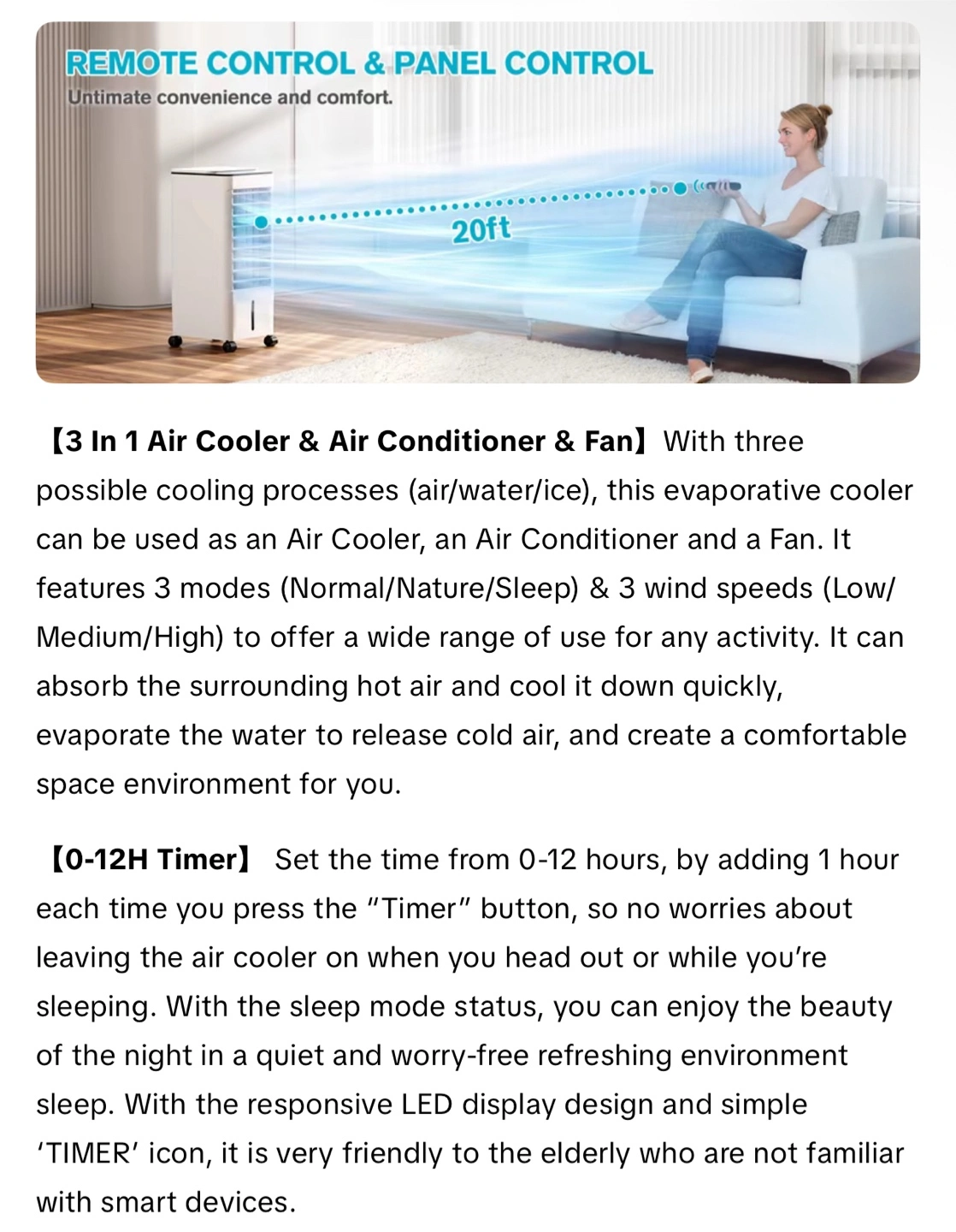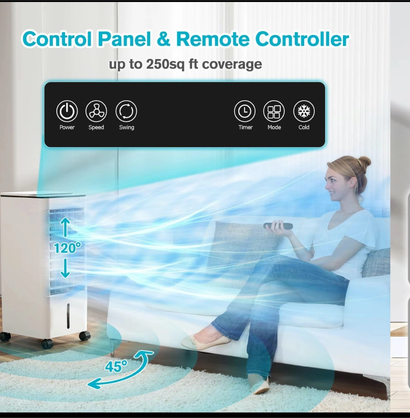 Selling a portable air conditioner fan from COOMER. It's a 3-in-1 evaporative air cooler with a remote. It has 3 modes, 3 speeds, and a 12-hour timer. Also included are 4 ice packs and 4 wheels. It has a 45° oscillation and is a quiet swamp cooler for home, bedroom, or office. It can cover up to 250 sq ft. Originally bought for $128!
