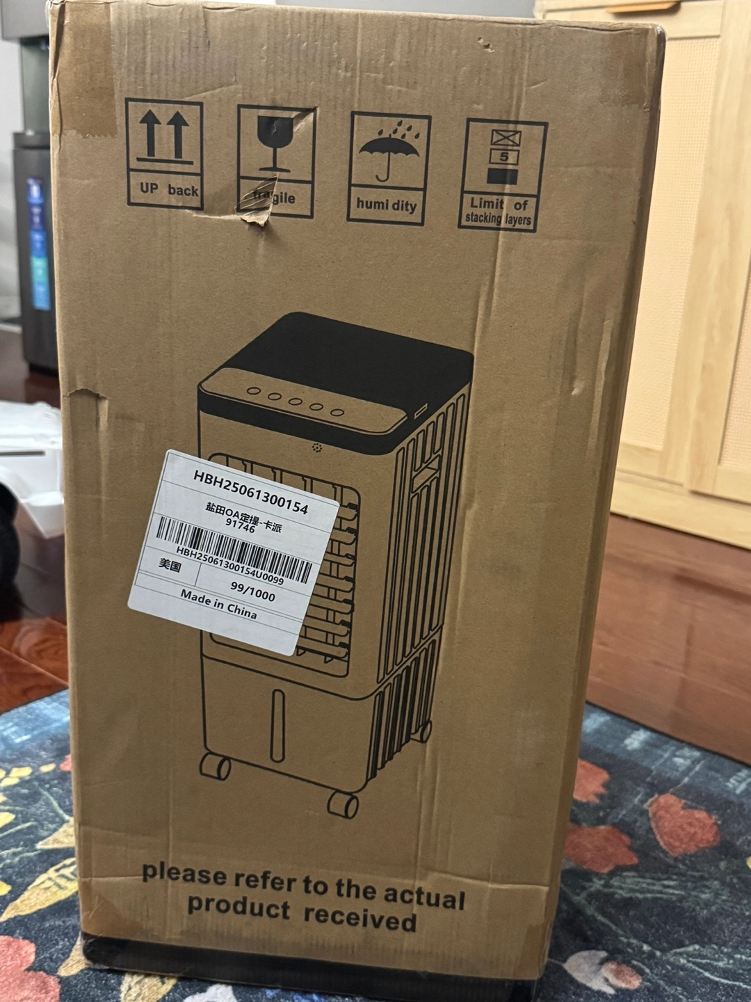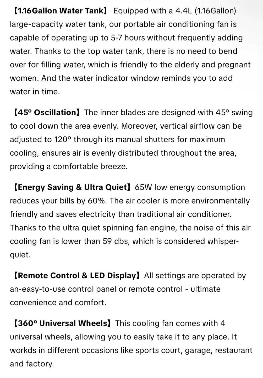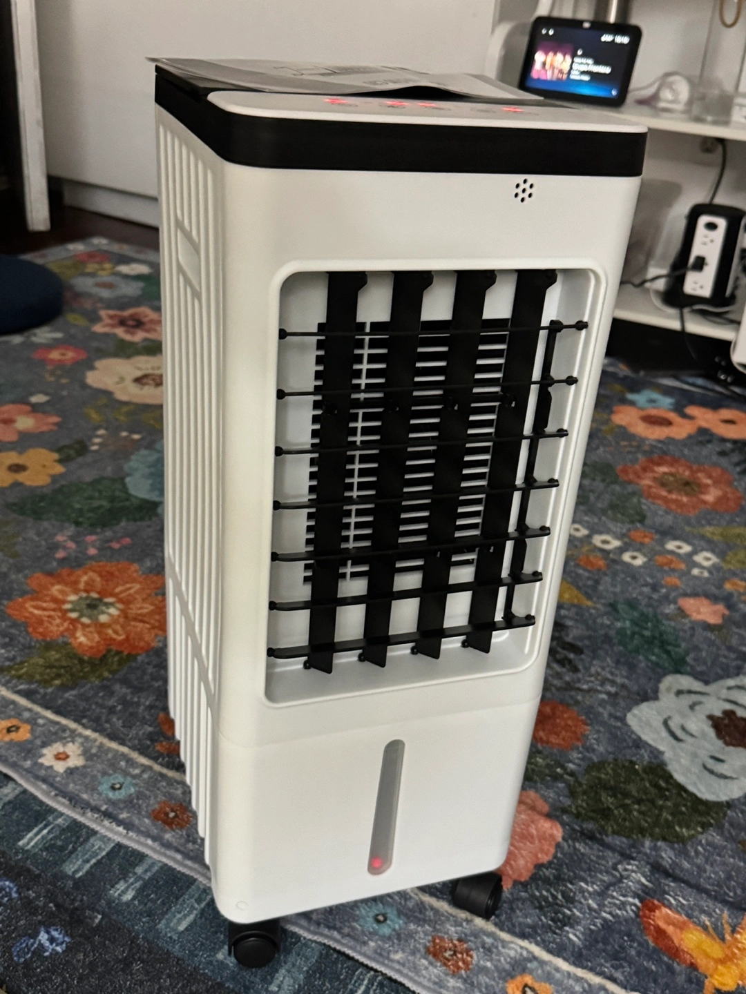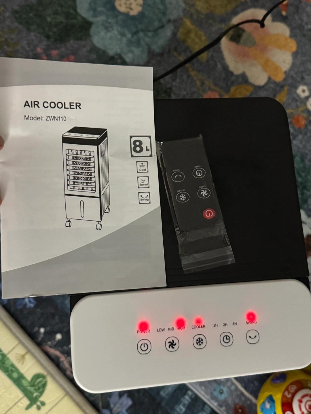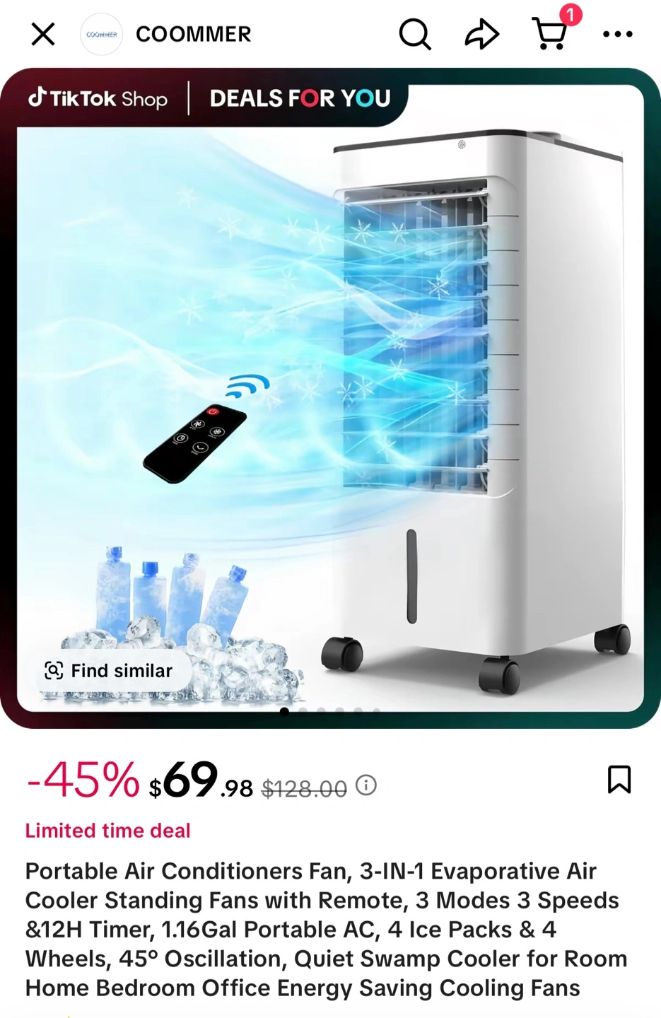 Selling a portable air conditioner fan from COOMER. It's a 3-in-1 evaporative air cooler with a remote. It has 3 modes, 3 speeds, and a 12-hour timer. Also included are 4 ice packs and 4 wheels. It has a 45° oscillation and is a quiet swamp cooler for home, bedroom, or office. It can cover up to 250 sq ft. Originally bought for $128!