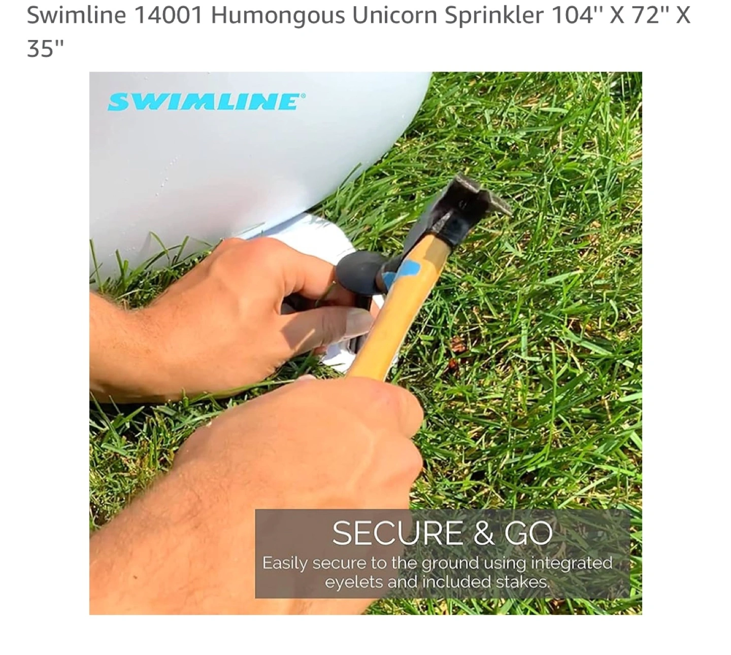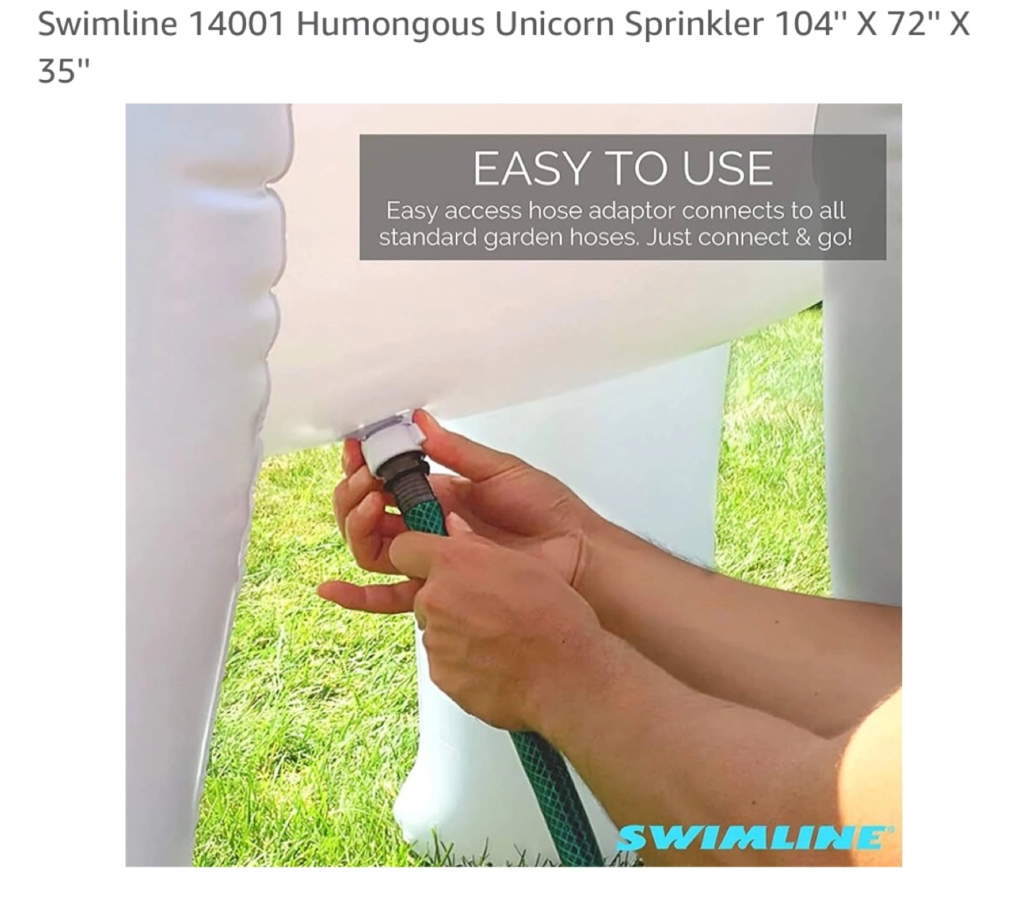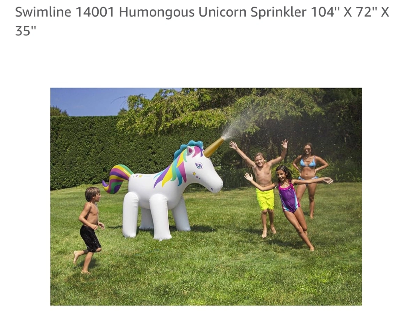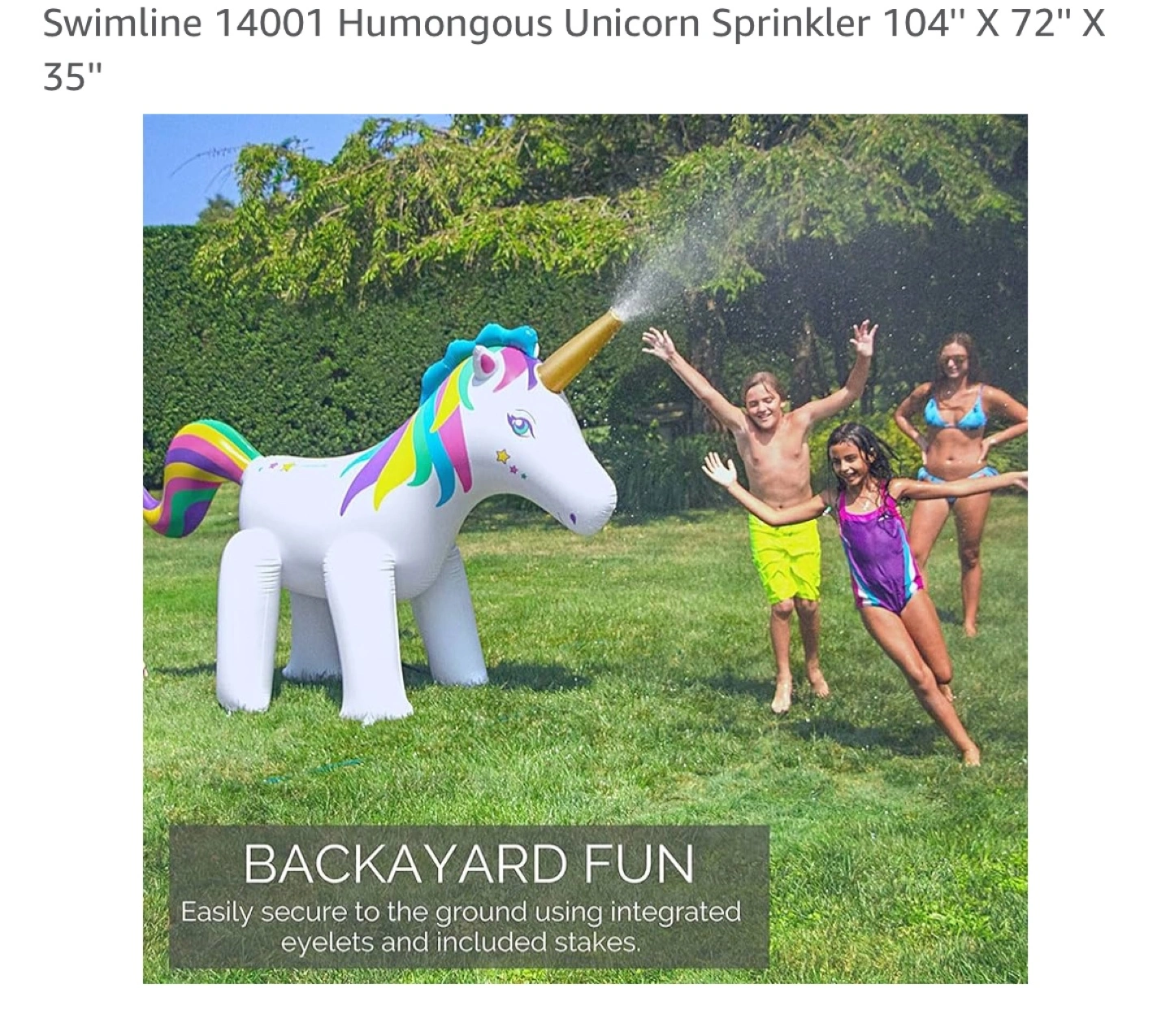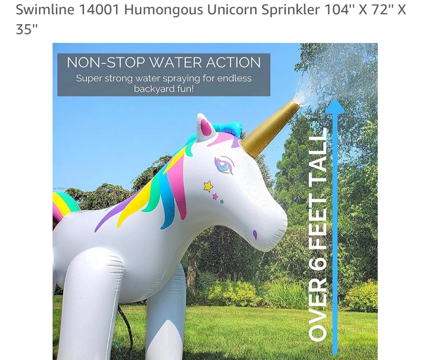 145Get ready for some backyard fun with this Swimline Humongous Unicorn Sprinkler! It's in great condition and ready to bring some smiles. - Dimensions: 104" x 72" x 35" - Over 6 feet tall! - High Quality Durable PVC - Patch kit included - UV resistant material It's perfect for keeping cool on those hot summer days!