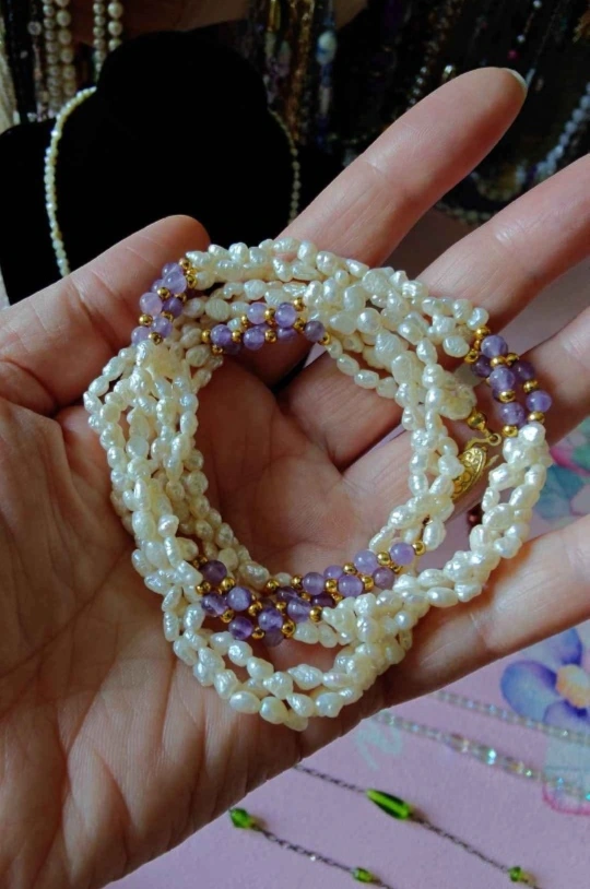 A lovely multi-strand necklace featuring freshwater pearls, amethyst beads, and gold accents. It's in great condition and ready to add a touch of elegance to any outfit