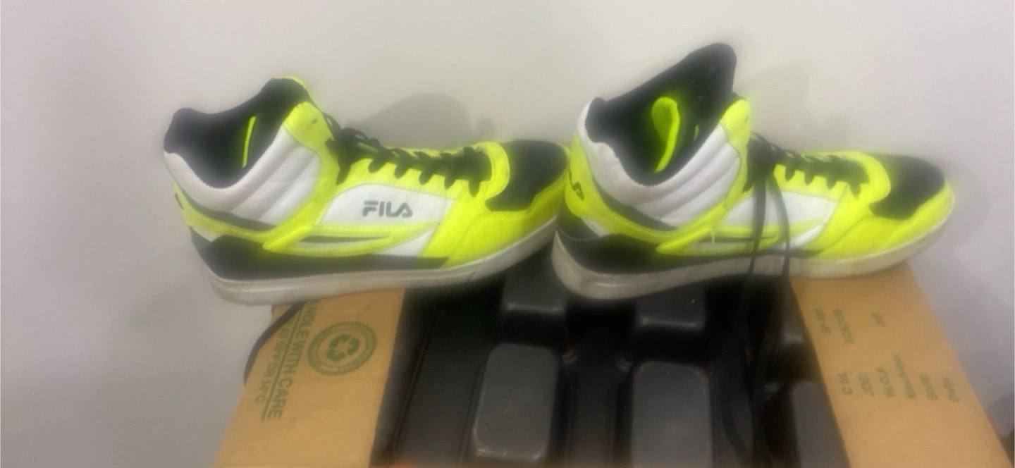 Selling a pair of Fila athletic shoes. They are black, white, and neon yellow. Please note that the size is unknown. Size 12