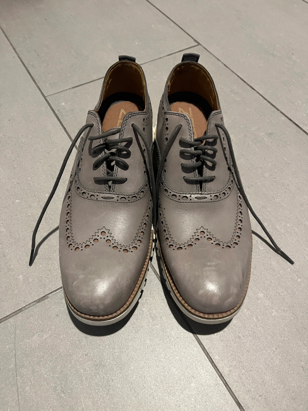 Selling a pair of Cole Haan wingtip Oxford shoes in size 10. They're a stylish gray leather and in good condition! The style number is FT C23743. Retail value 300.00 CAD