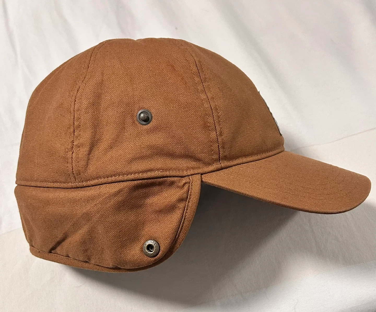 Carhartt brown cap with ear flaps. Shell: 97% Cotton, 3% Elastane. Lining: 100% Polyester. It's made in Vietnam.