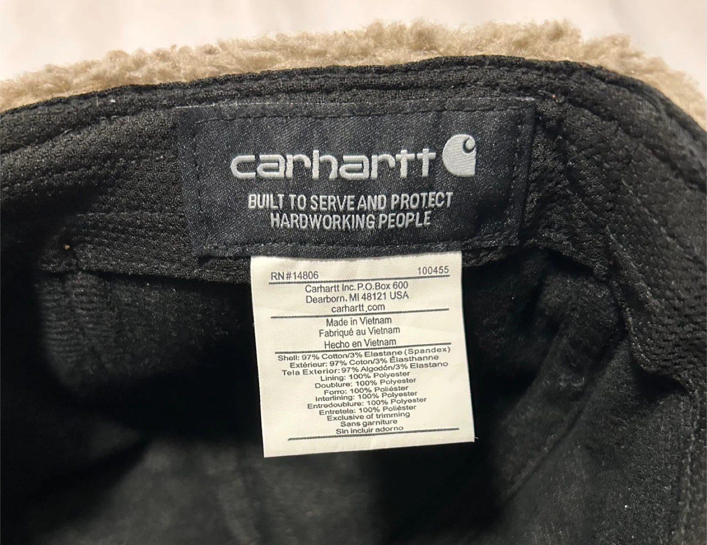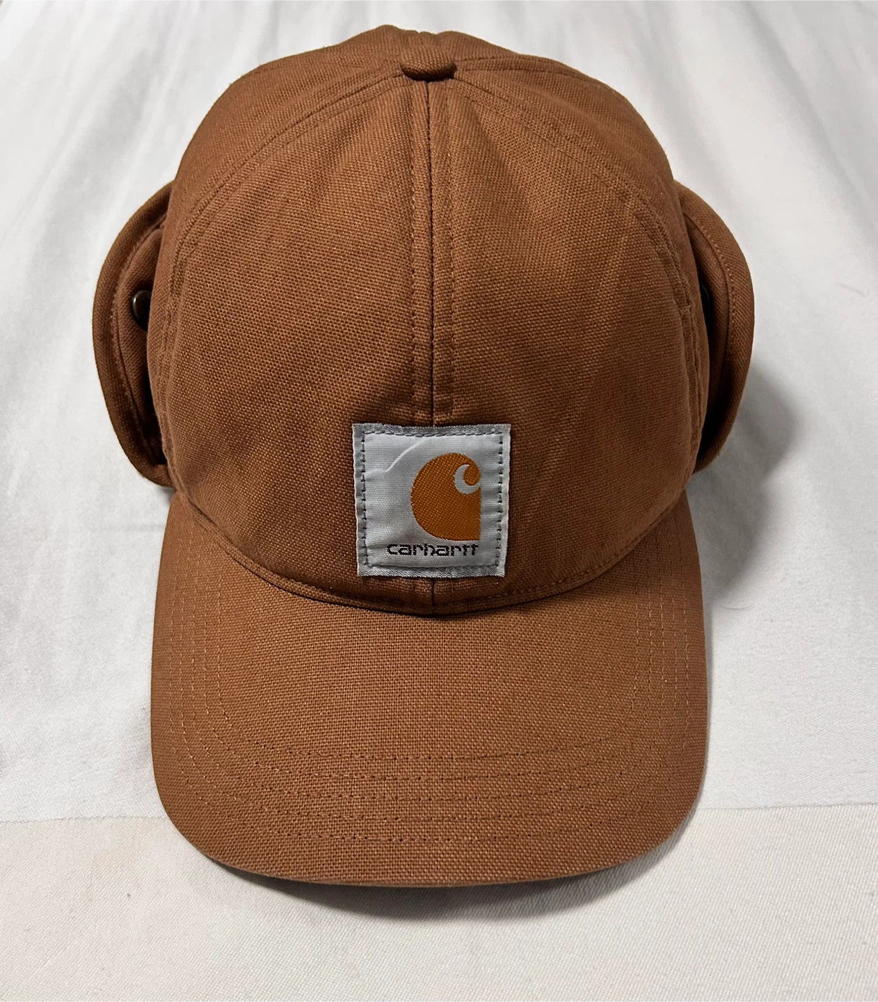 Carhartt brown cap with ear flaps. Shell: 97% Cotton, 3% Elastane. Lining: 100% Polyester. It's made in Vietnam.