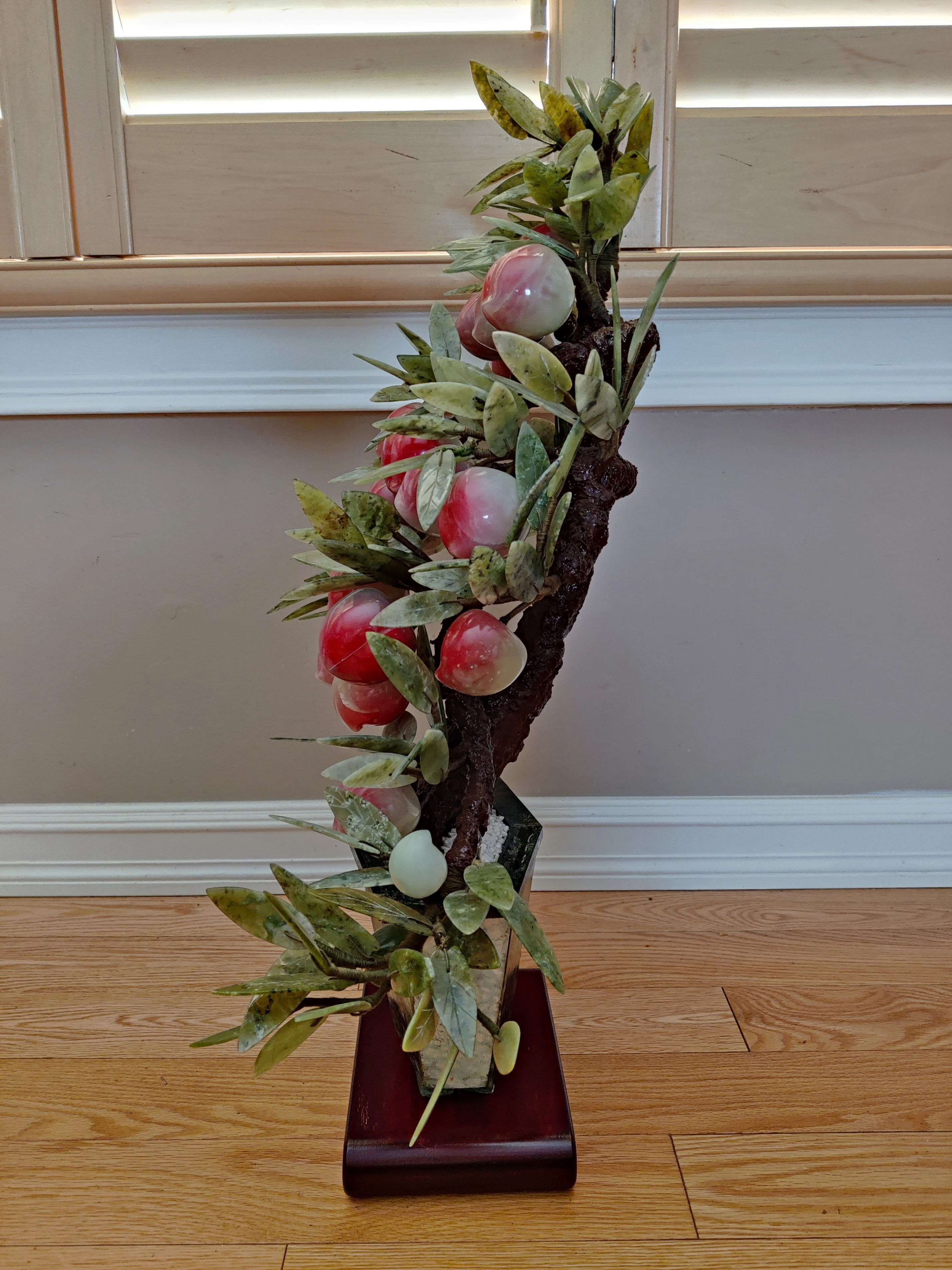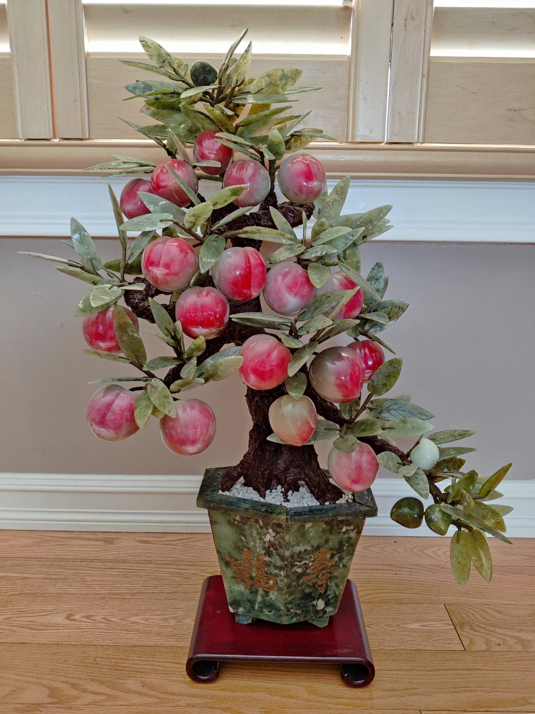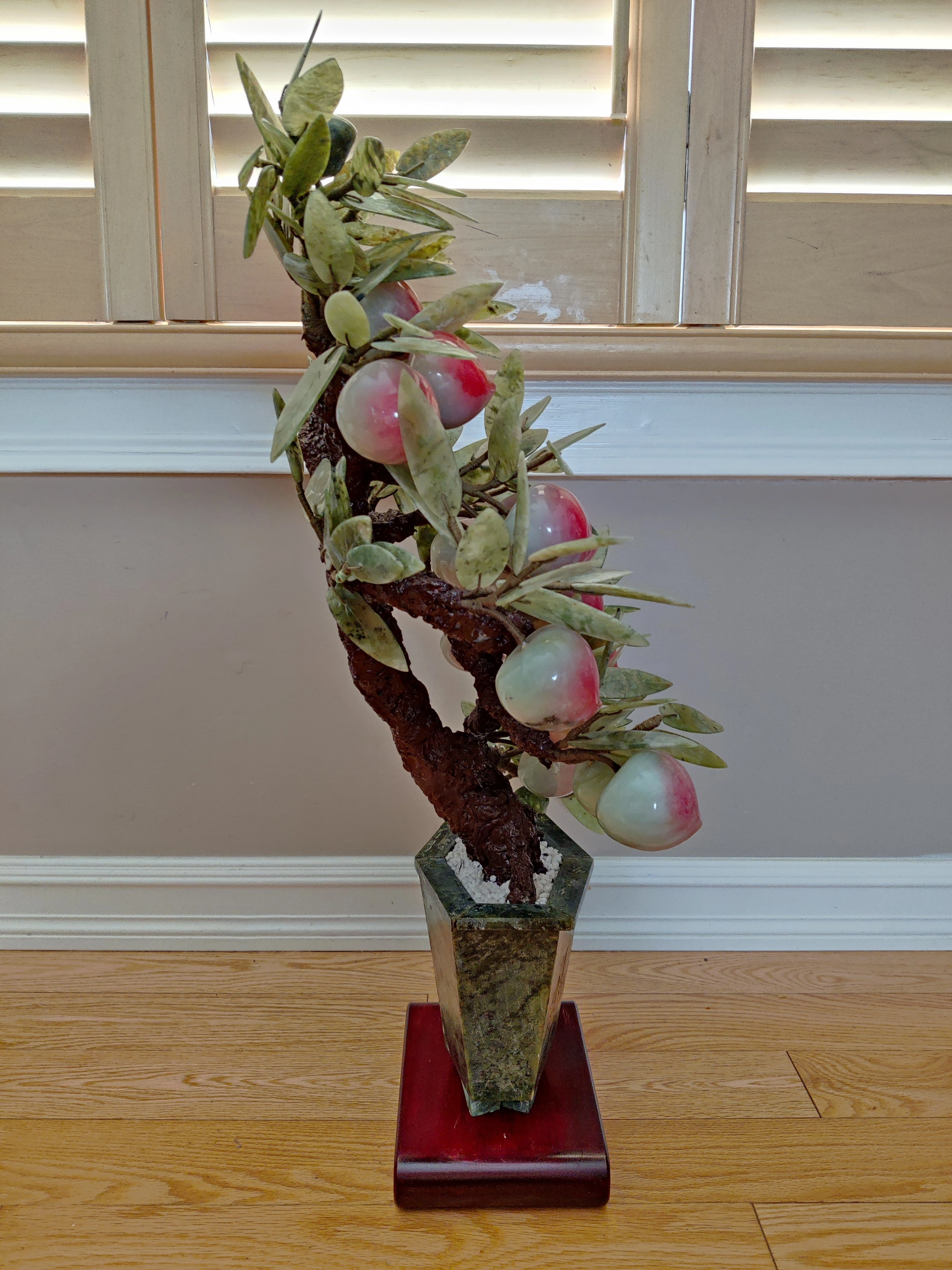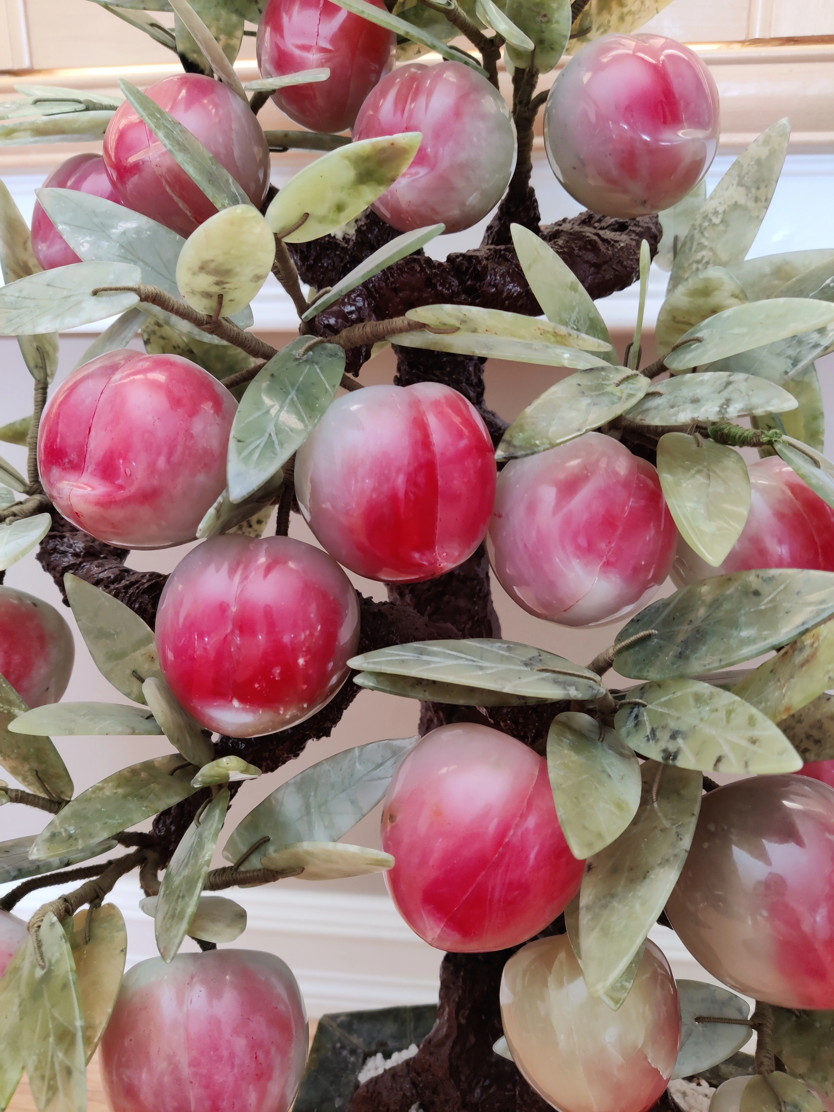 This is a stunning and substantial vintage Chinese decorative art piece—a large bonsai-style tree with jade leaves and hardstone peaches. Known as a symbol of longevity, immortality, and unity in Chinese culture, this is more than just a decorative item; it's a piece rich with meaning.