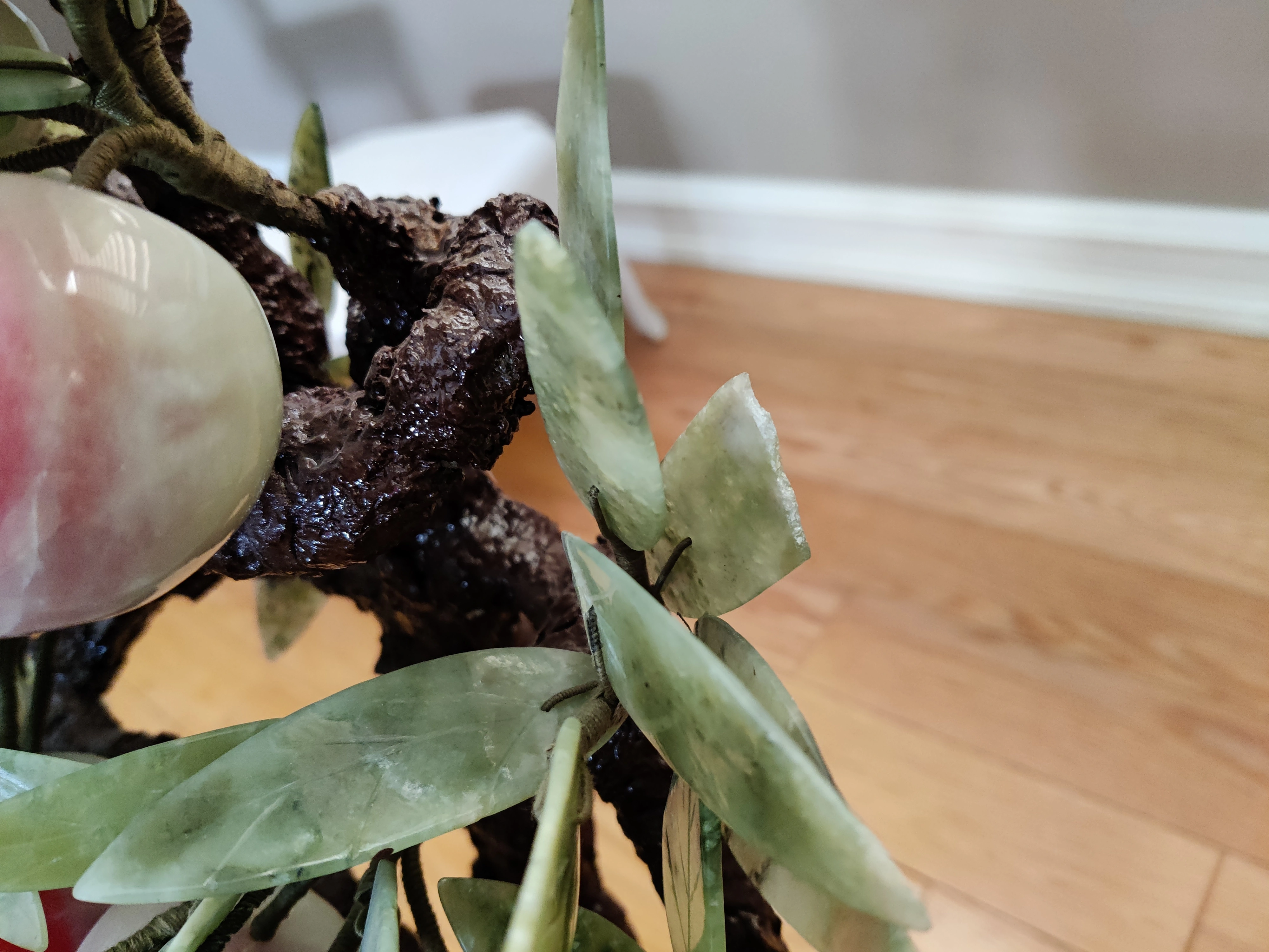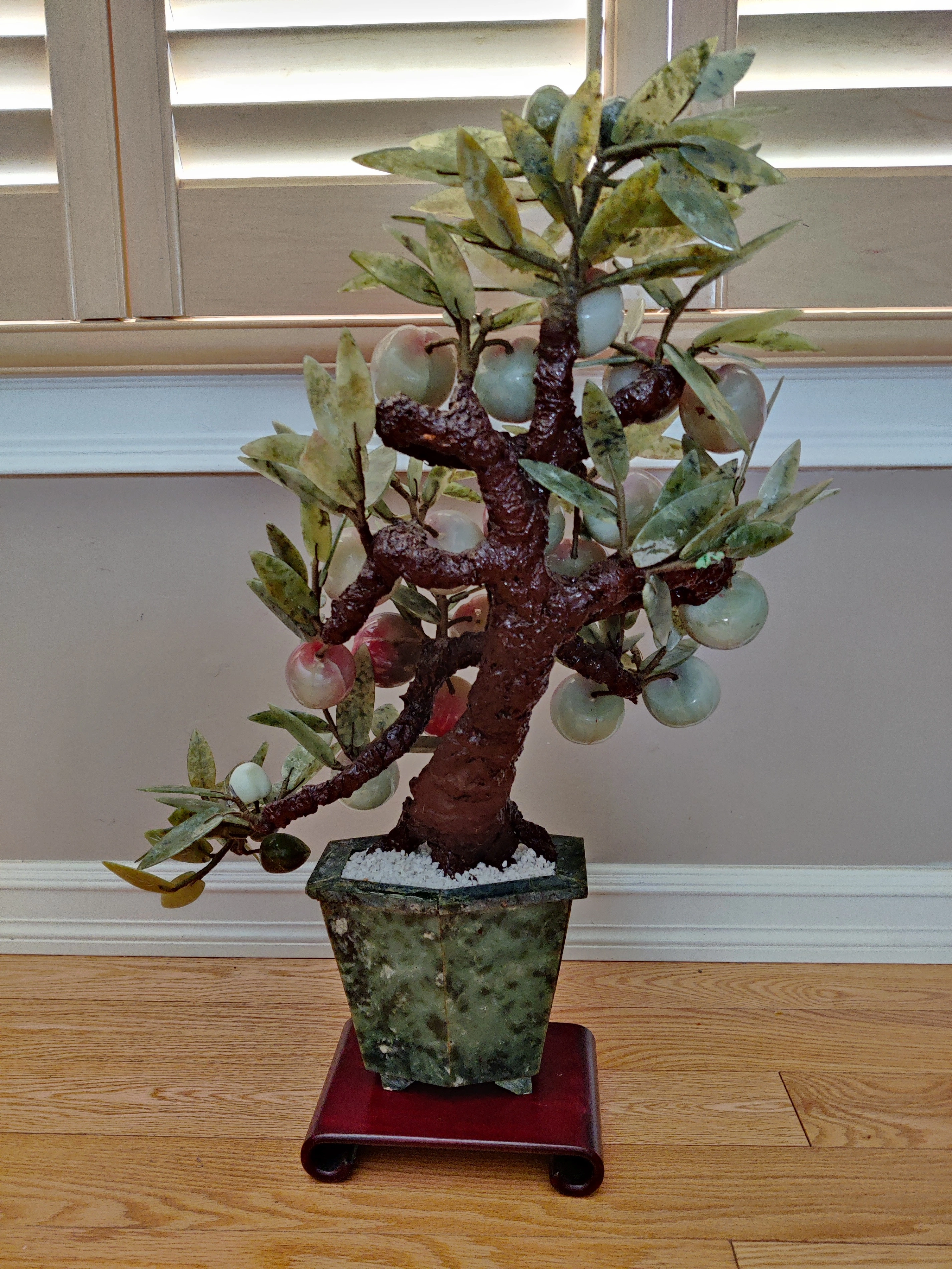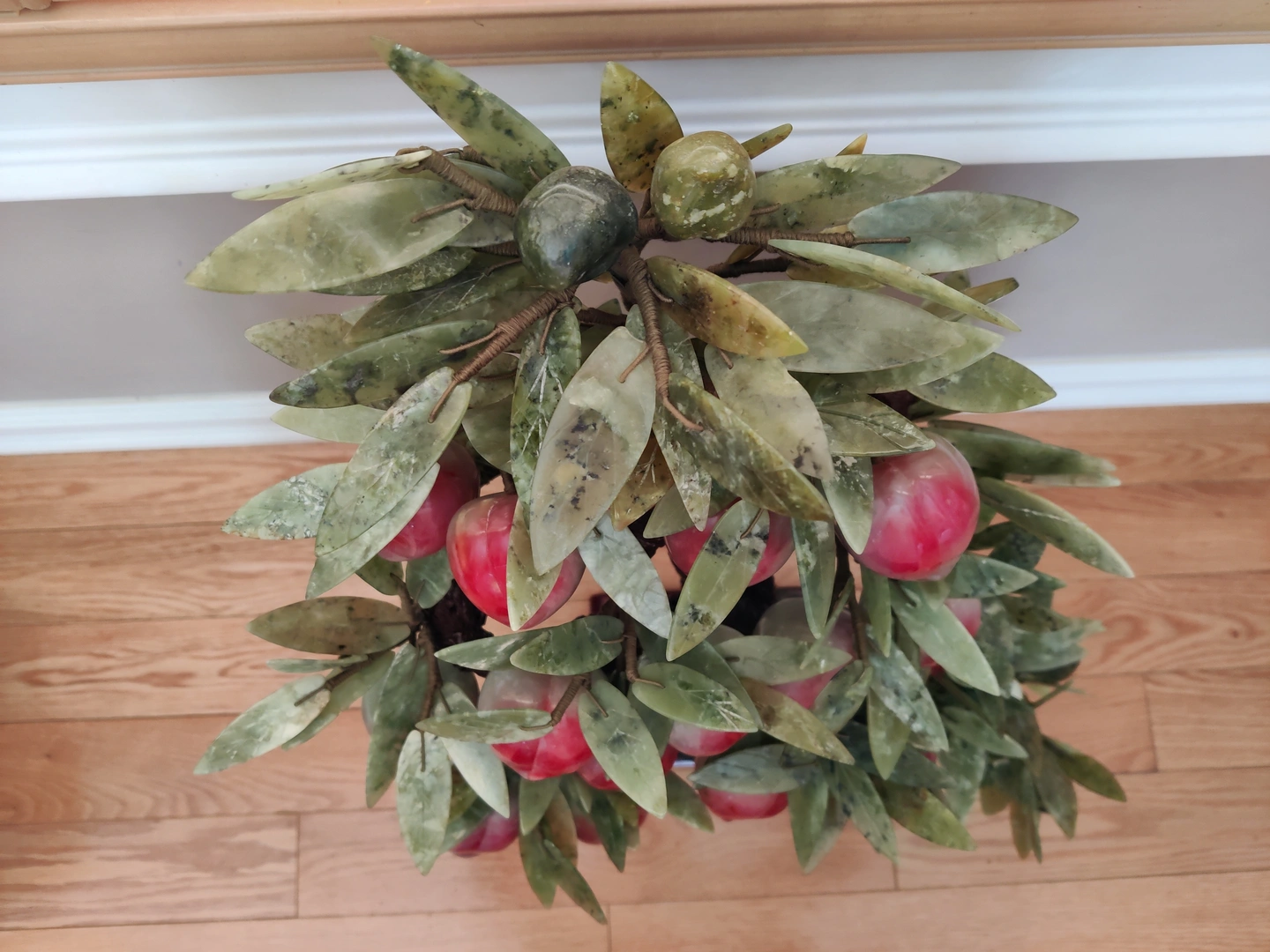 NOTE: The tree is in excellent overall condition, with vibrant colors and dense foliage. Please note that one jade leaf has broken off, as shown in the attached pictures. This is a minor flaw that does not detract from the beauty or overall integrity of the piece, and no other leaves or components are damaged. The craftsmanship and size make it an impressive and unique find for any collector or decorator. See the attached pictures.