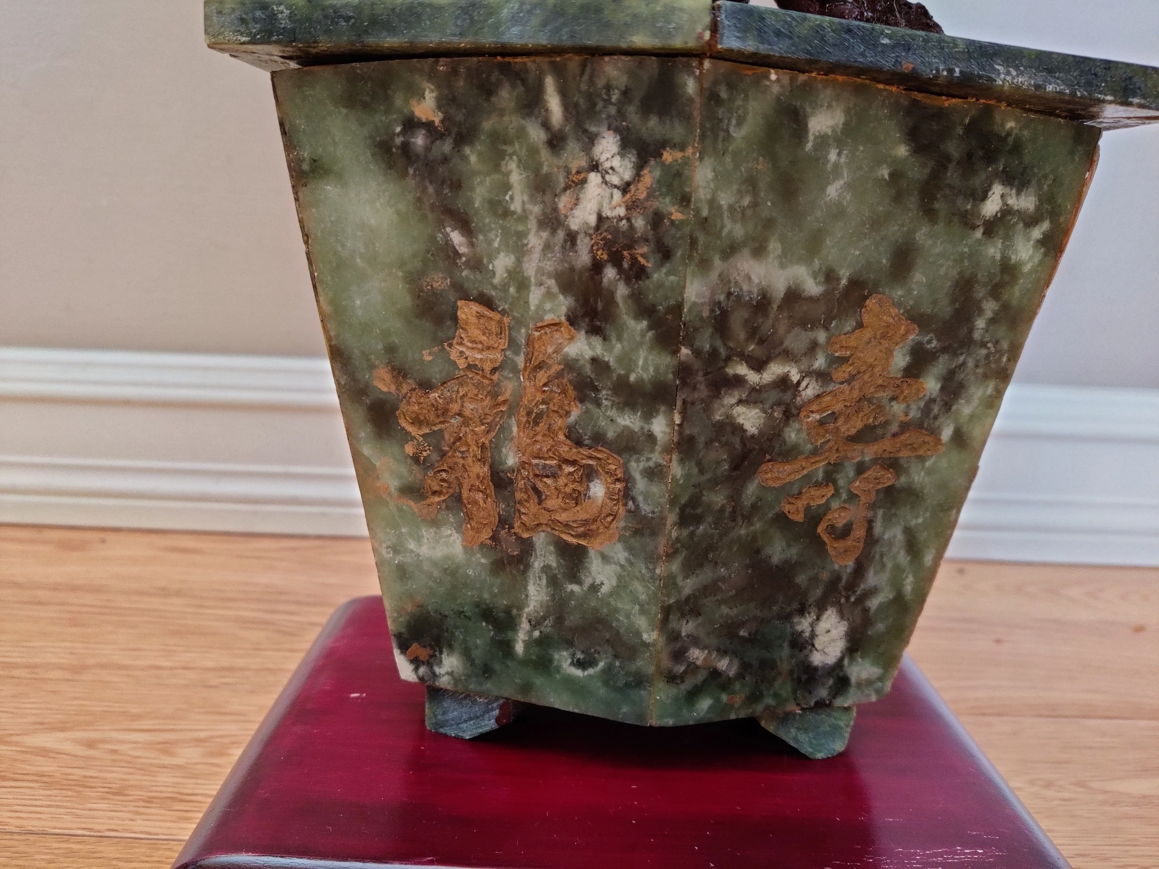 The entire tree is secured within a heavy, polished hardstone vase, which is a rich green hue and adds a sense of stability and elegance. This vase sits on a custom-fitted, dark wooden stand, elevating the piece and making it a perfect centerpiece.