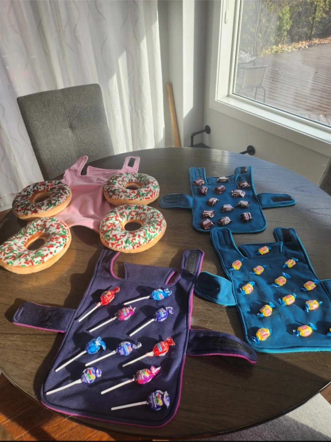 FREE- Get ready for Halloween with these adorable candy-themed pet costumes! There's a cute pink one with sprinkle donuts, and two blue ones – one with mini chocolate bars and another with M&Ms. The purple one features lollipops. Located in Cougar Ridge