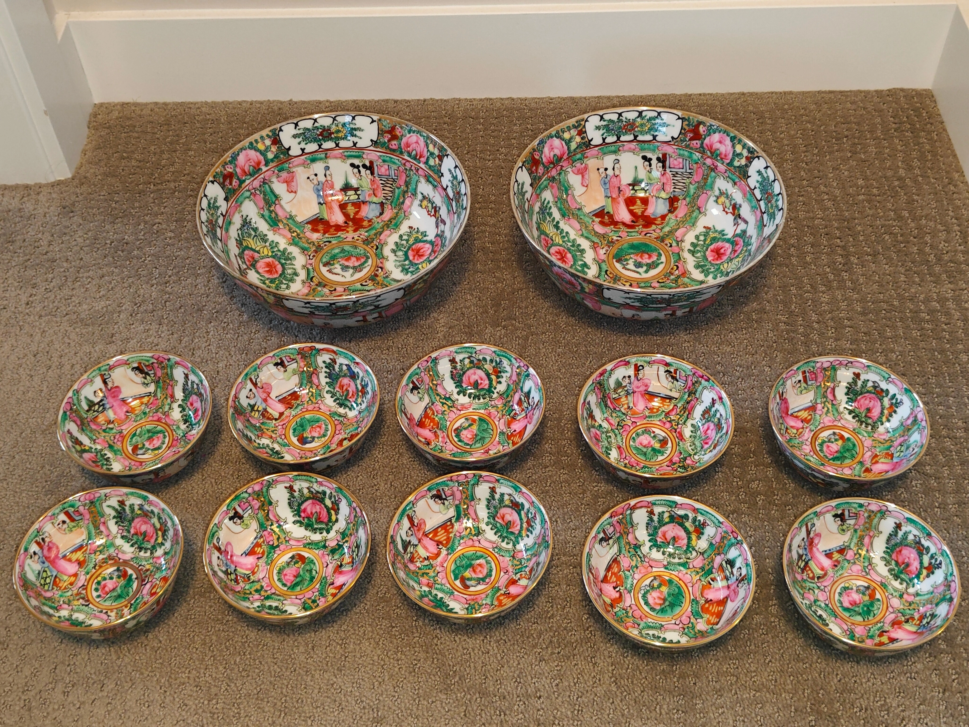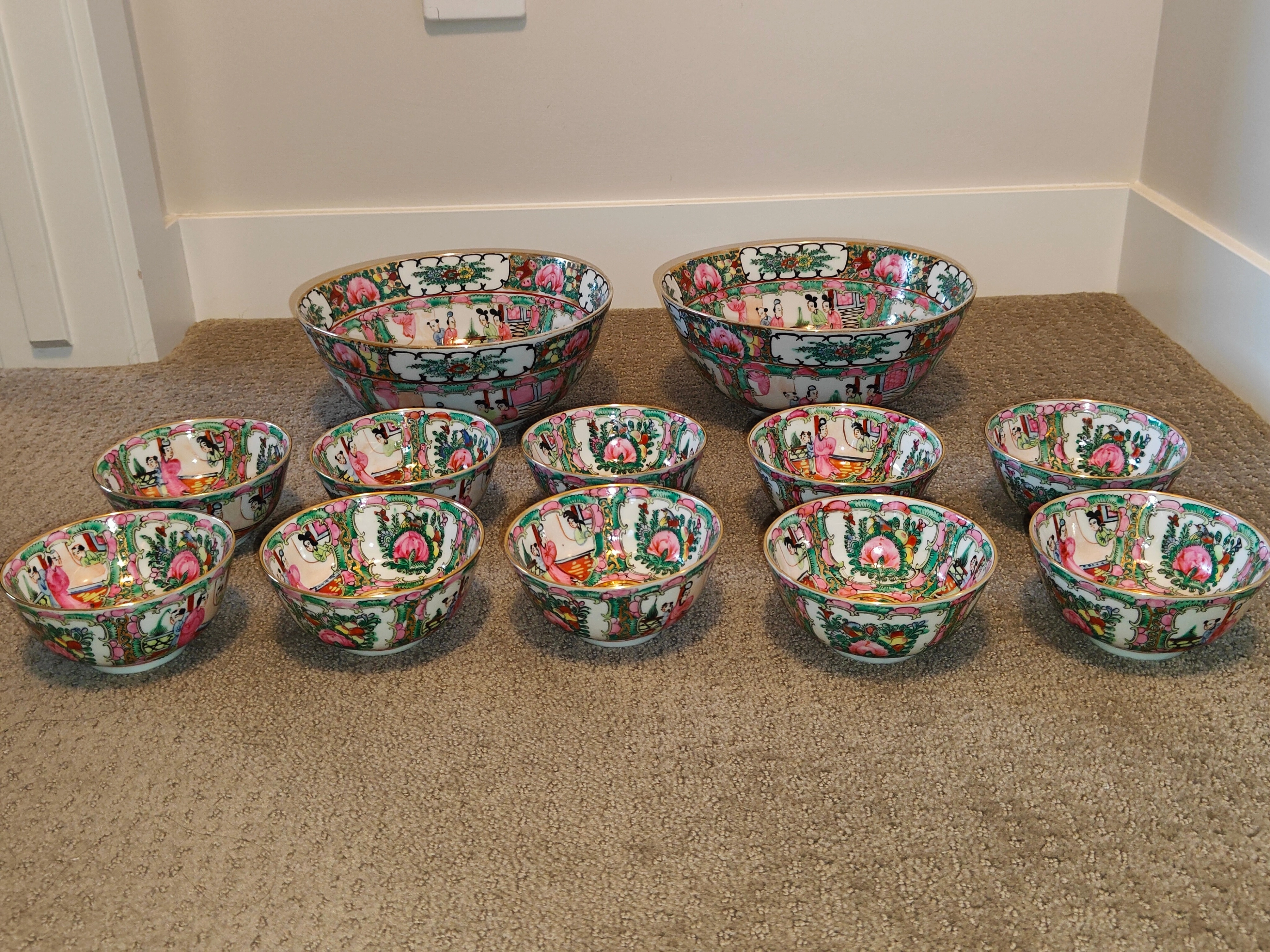 I am selling an Antique Chinese Asian China Rose Medallion Famille Porcelain Hand Painted Dinnerware Bowl Set in new condition. Never been used and no chips or cracks on any of the bowls. This stunning and rare 12-piece set of hand-painted porcelain bowls brings the timeless elegance of traditional Chinese artistry to your table. In pristine, new condition, these bowls have never been used and are free of any chips or cracks, preserving their original beauty.