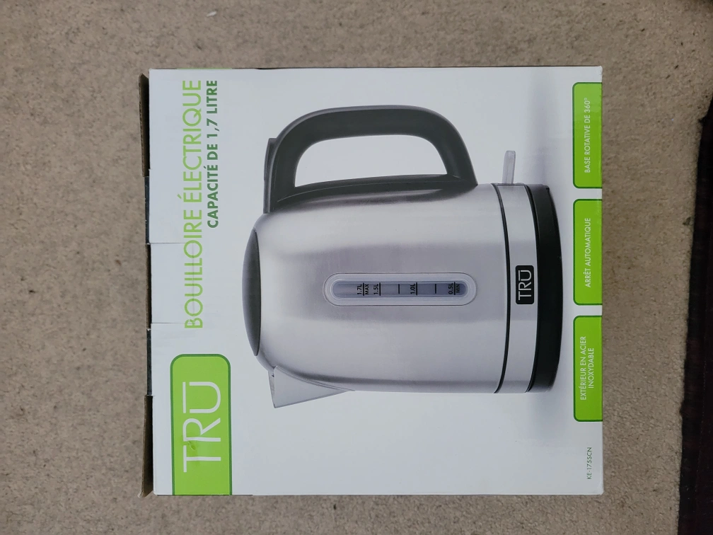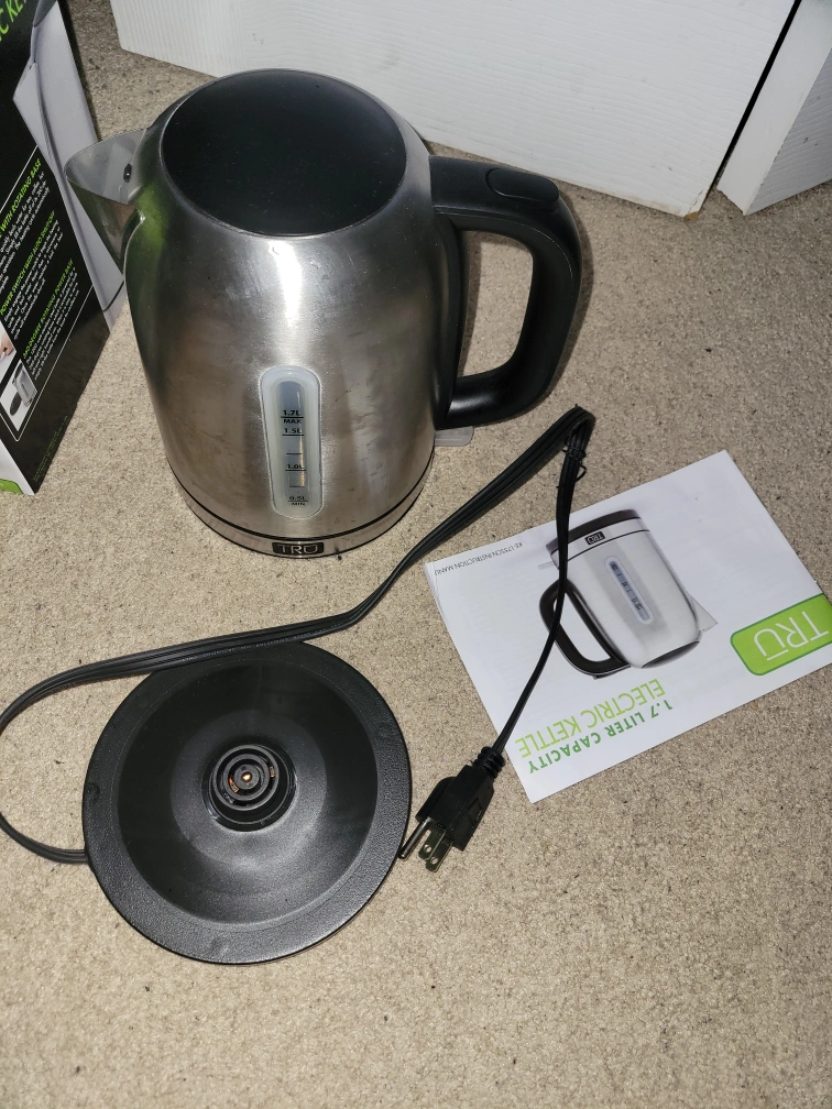 Selling a TRU 1.7 liter electric kettle. It comes with the box and instructions. It has a 1.7 liter capacity and a base that rotates 360 degrees. It also has an automatic shut-off feature. It is in good condition and ready for a new home!