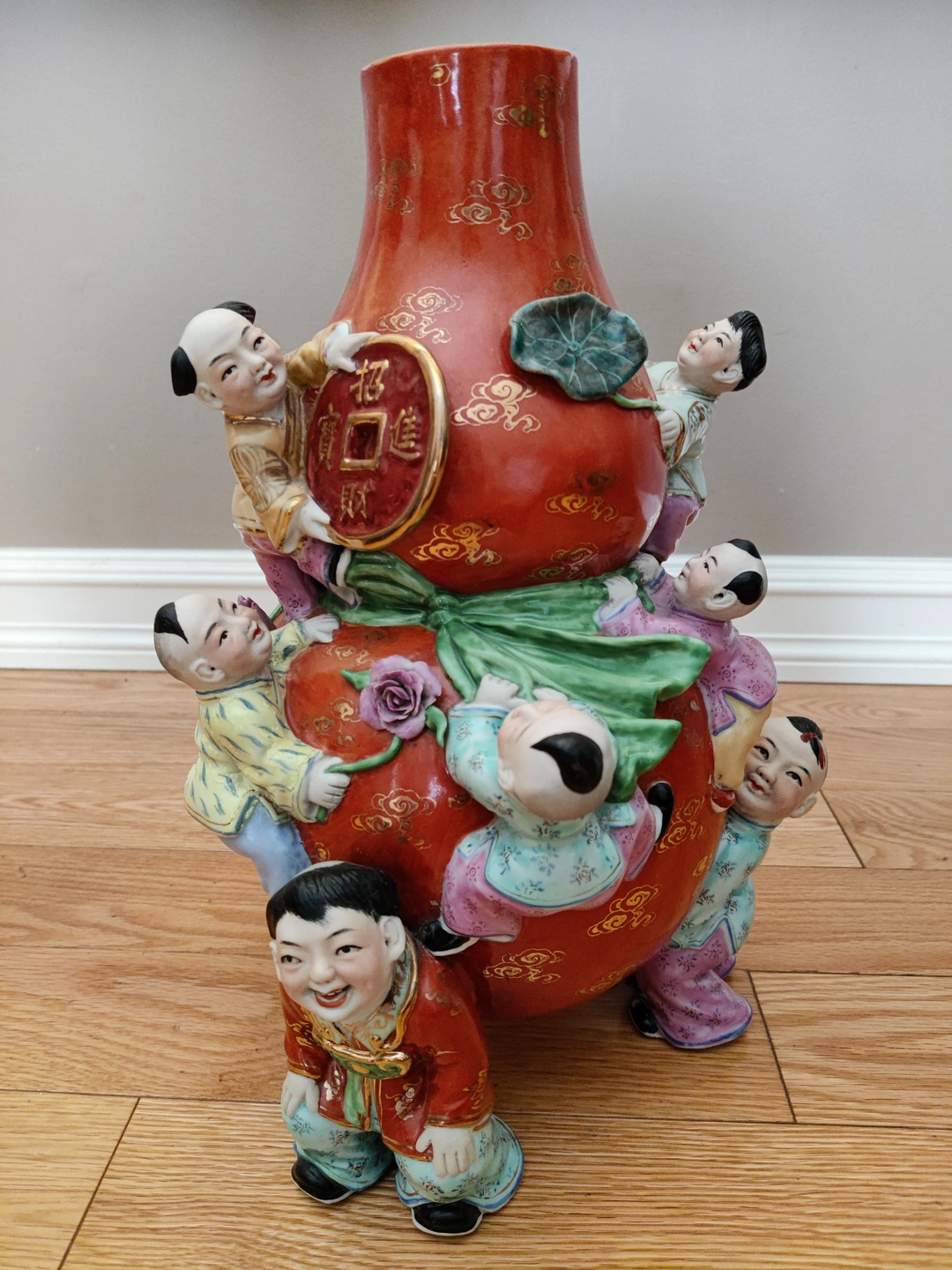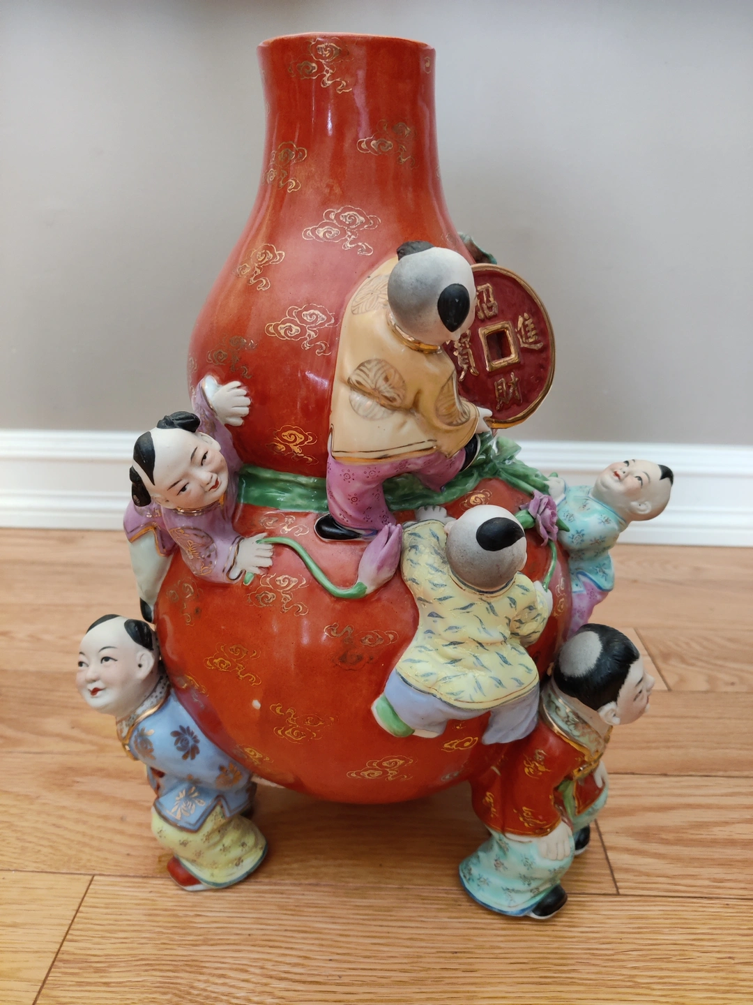 The "Nine Children" motif is a powerful symbol in Chinese culture, representing abundance, good fortune, prosperity, and the wish for a large, happy family. The children are depicted playfully climbing and holding a gourd bag, which itself is a symbol of family happiness and good luck. The vibrant colors and dynamic poses of the children bring a joyful energy to the piece, making it not just a decorative item, but a work of art steeped in tradition and meaning. The inclusion of a large coin further emphasizes the theme of prosperity and wealth.