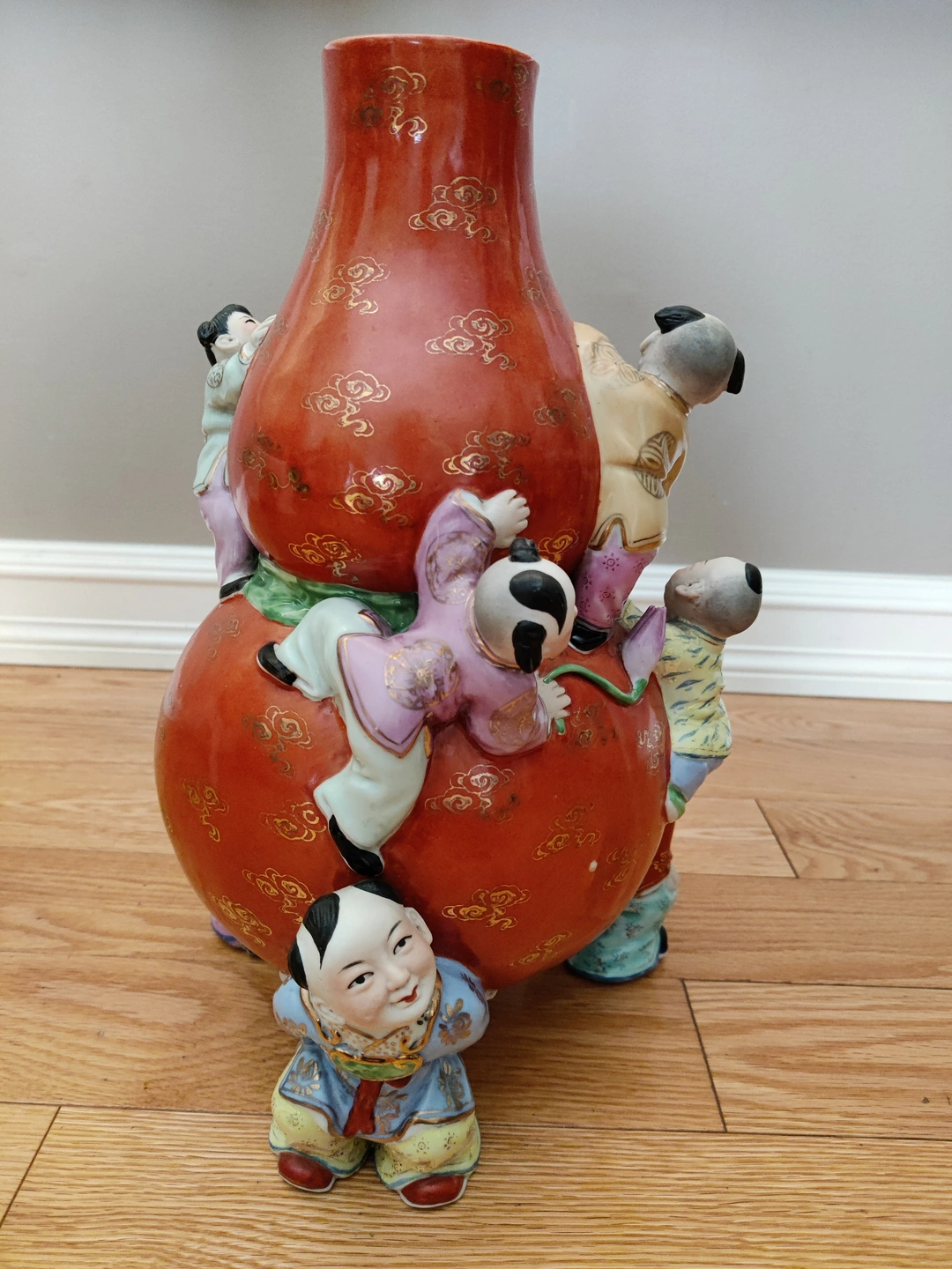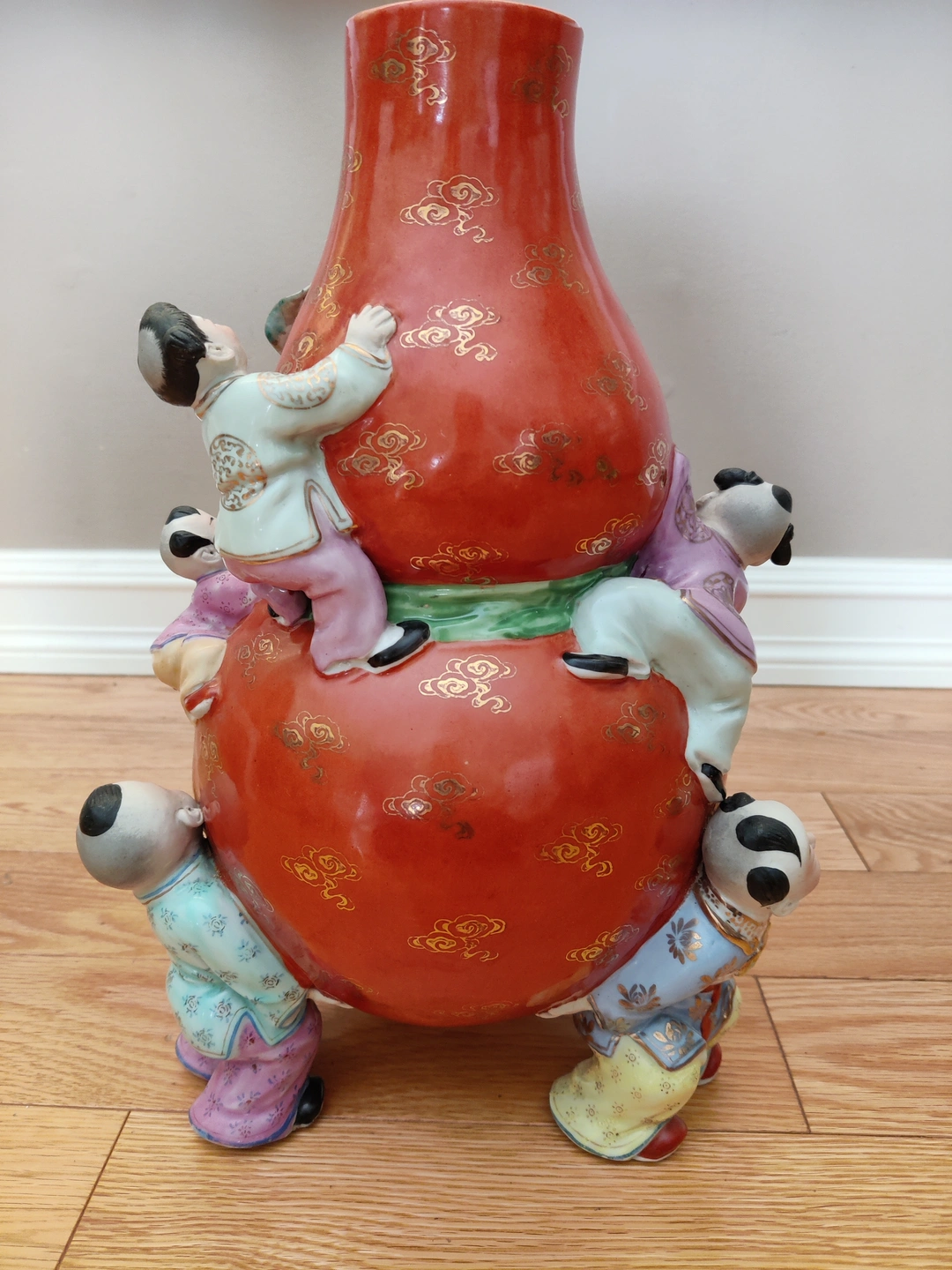 I am selling a Chinese Porcelain Famille Rose 9 Children Holding and Climbing Gourd Bag - Good Fortune Prosperity Art Vase in excellent condition. No chips or cracks. Chinese / Asian / Oriental Vintage Art. Elevate your collection with this exquisite and culturally significant Chinese porcelain vase. Known as a Nine Children vase, this piece is a beautiful example of Famille Rose enamelware, a style characterized by its soft color palette, particularly the dominant pink and red hues. The vase is in excellent condition, with no chips or cracks, showcasing the artistry and detail of its creation.