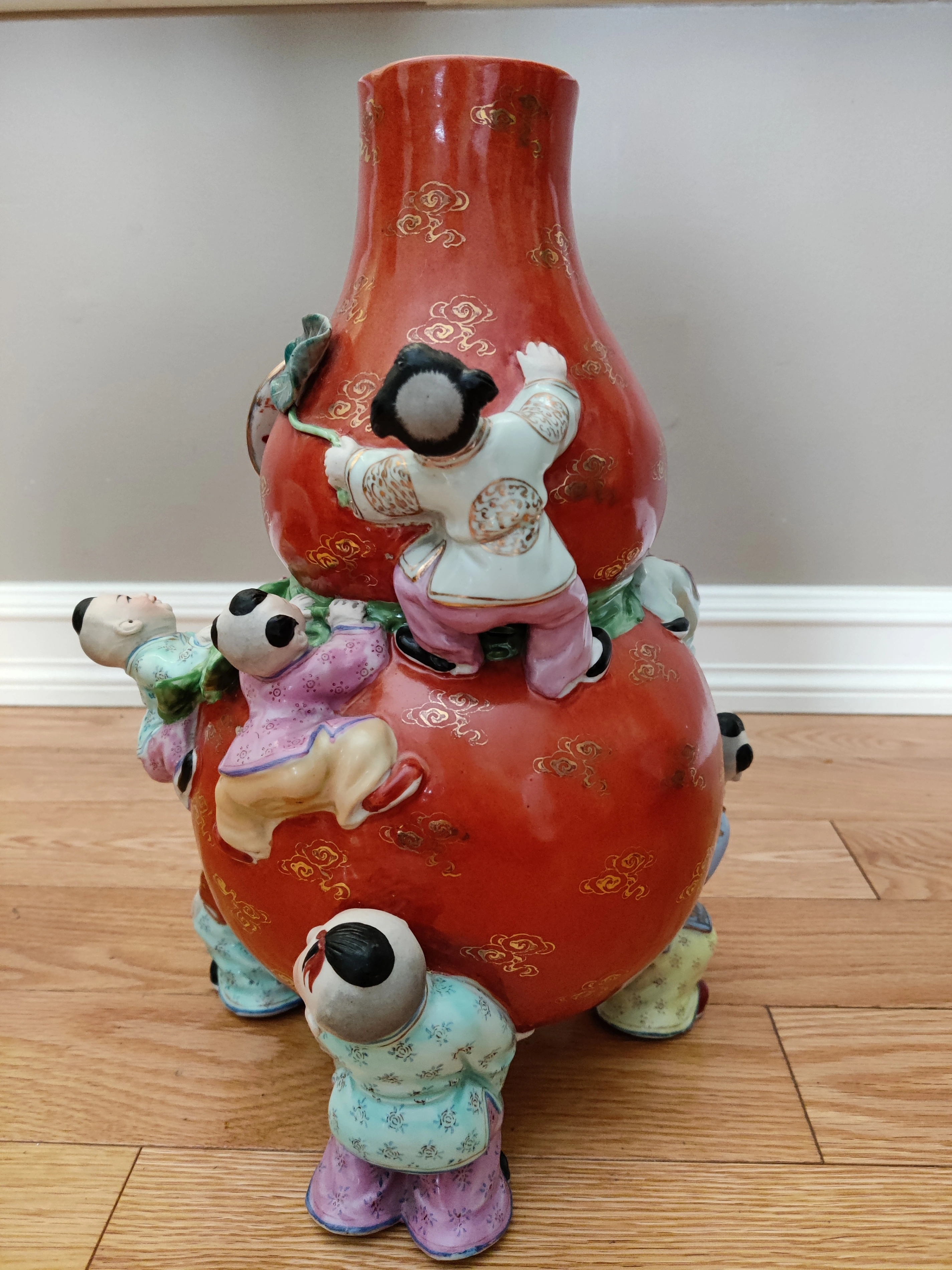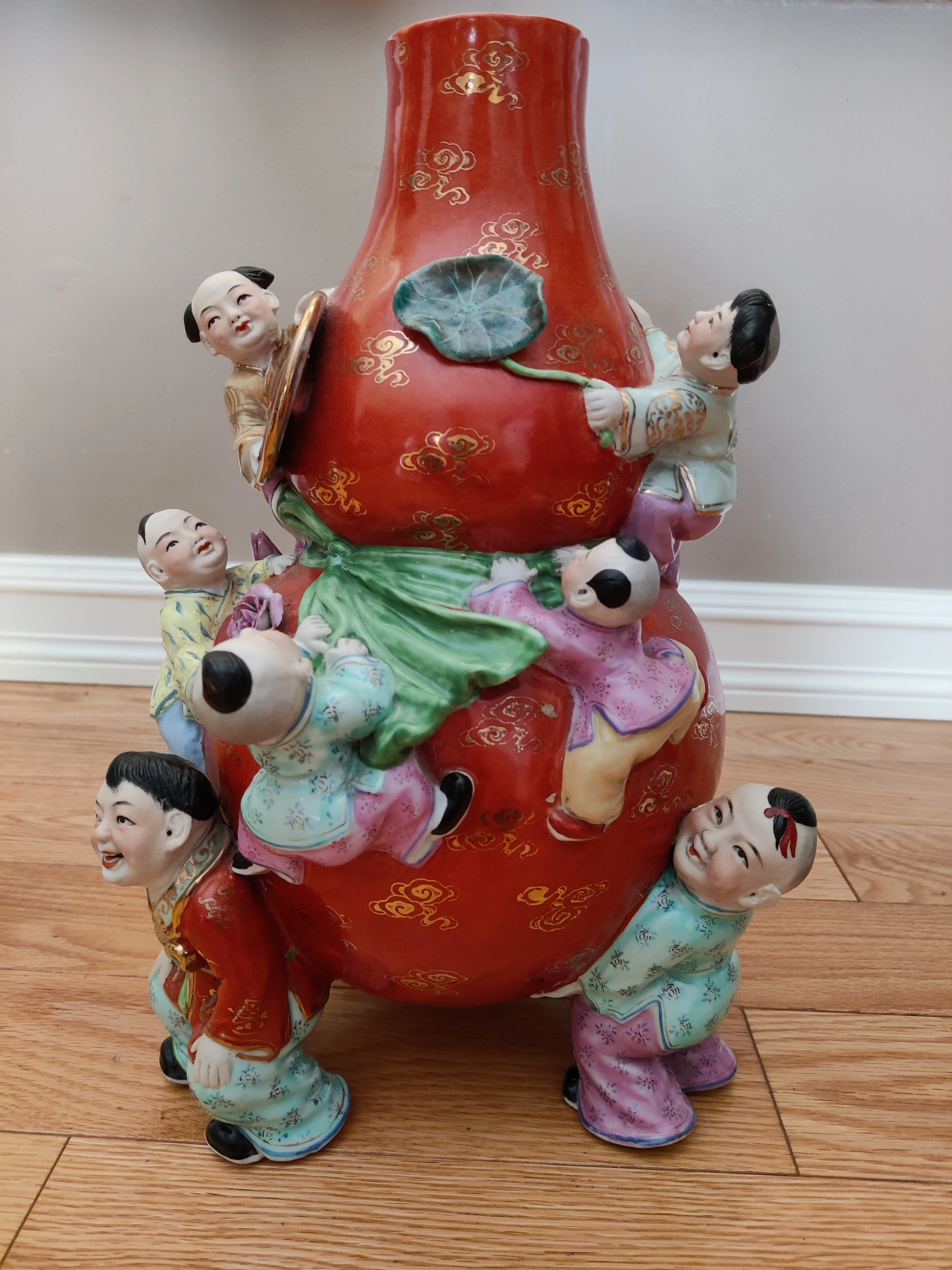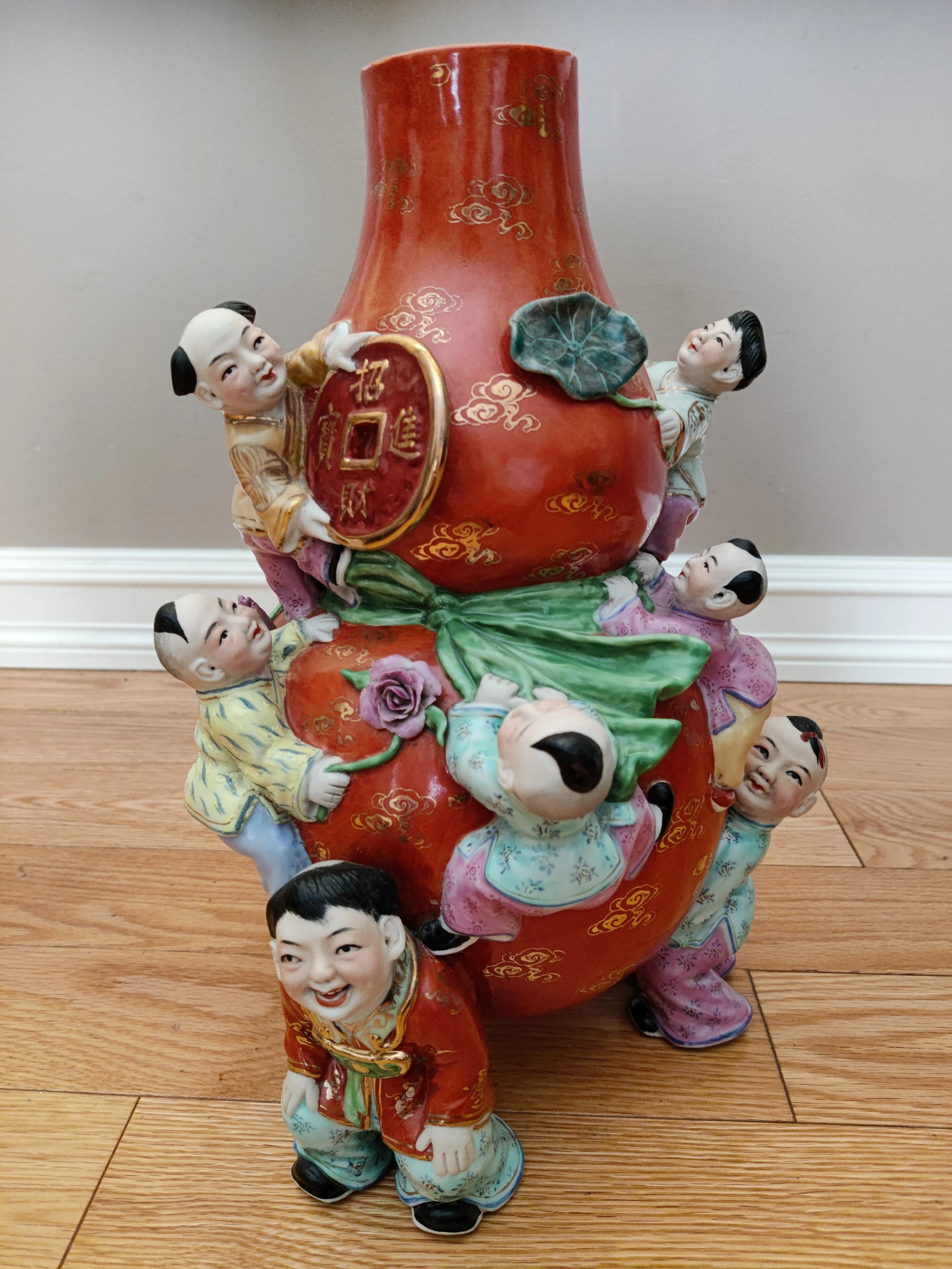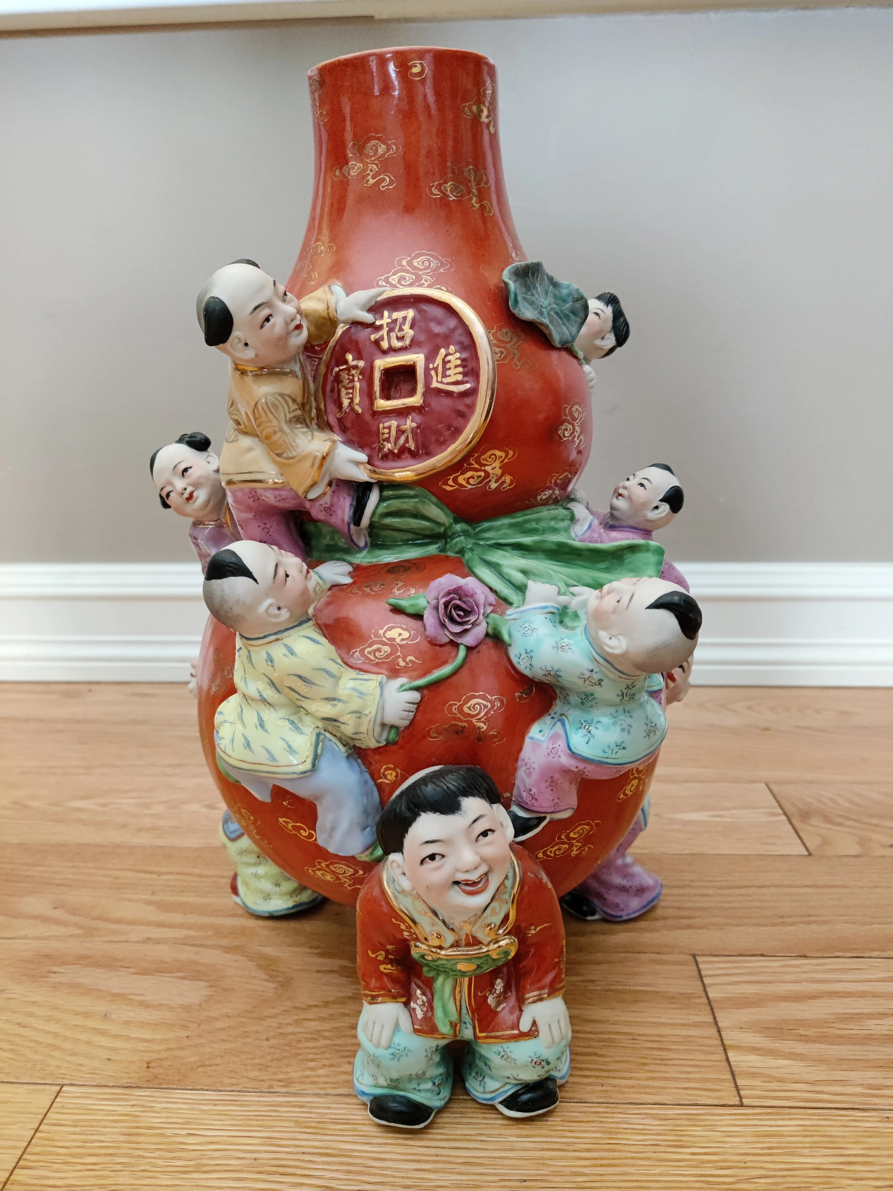 I am selling a Chinese Porcelain Famille Rose 9 Children Holding and Climbing Gourd Bag - Good Fortune Prosperity Art Vase in excellent condition. No chips or cracks. Chinese / Asian / Oriental Vintage Art. Elevate your collection with this exquisite and culturally significant Chinese porcelain vase. Known as a Nine Children vase, this piece is a beautiful example of Famille Rose enamelware, a style characterized by its soft color palette, particularly the dominant pink and red hues. The vase is in excellent condition, with no chips or cracks, showcasing the artistry and detail of its creation.