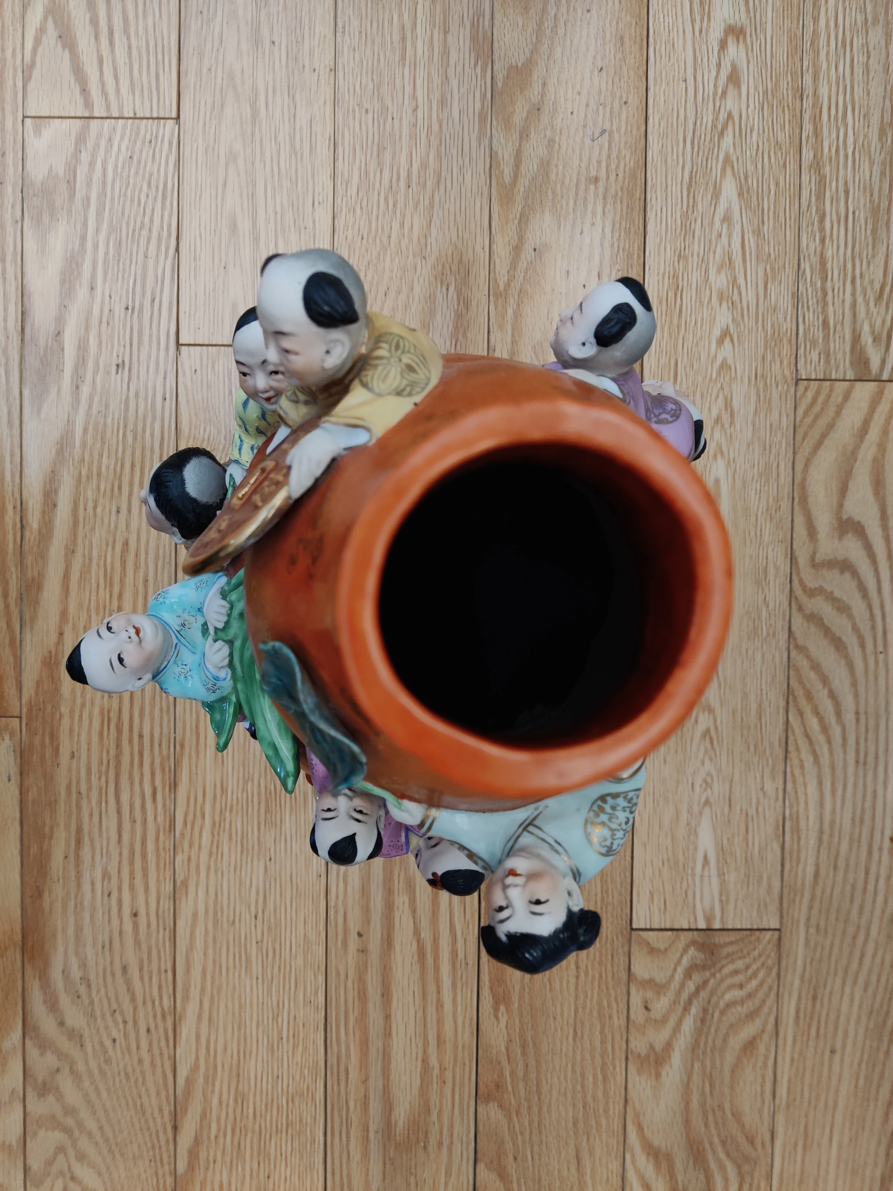 The "Nine Children" motif is a powerful symbol in Chinese culture, representing abundance, good fortune, prosperity, and the wish for a large, happy family. The children are depicted playfully climbing and holding a gourd bag, which itself is a symbol of family happiness and good luck. The vibrant colors and dynamic poses of the children bring a joyful energy to the piece, making it not just a decorative item, but a work of art steeped in tradition and meaning. The inclusion of a large coin further emphasizes the theme of prosperity and wealth.