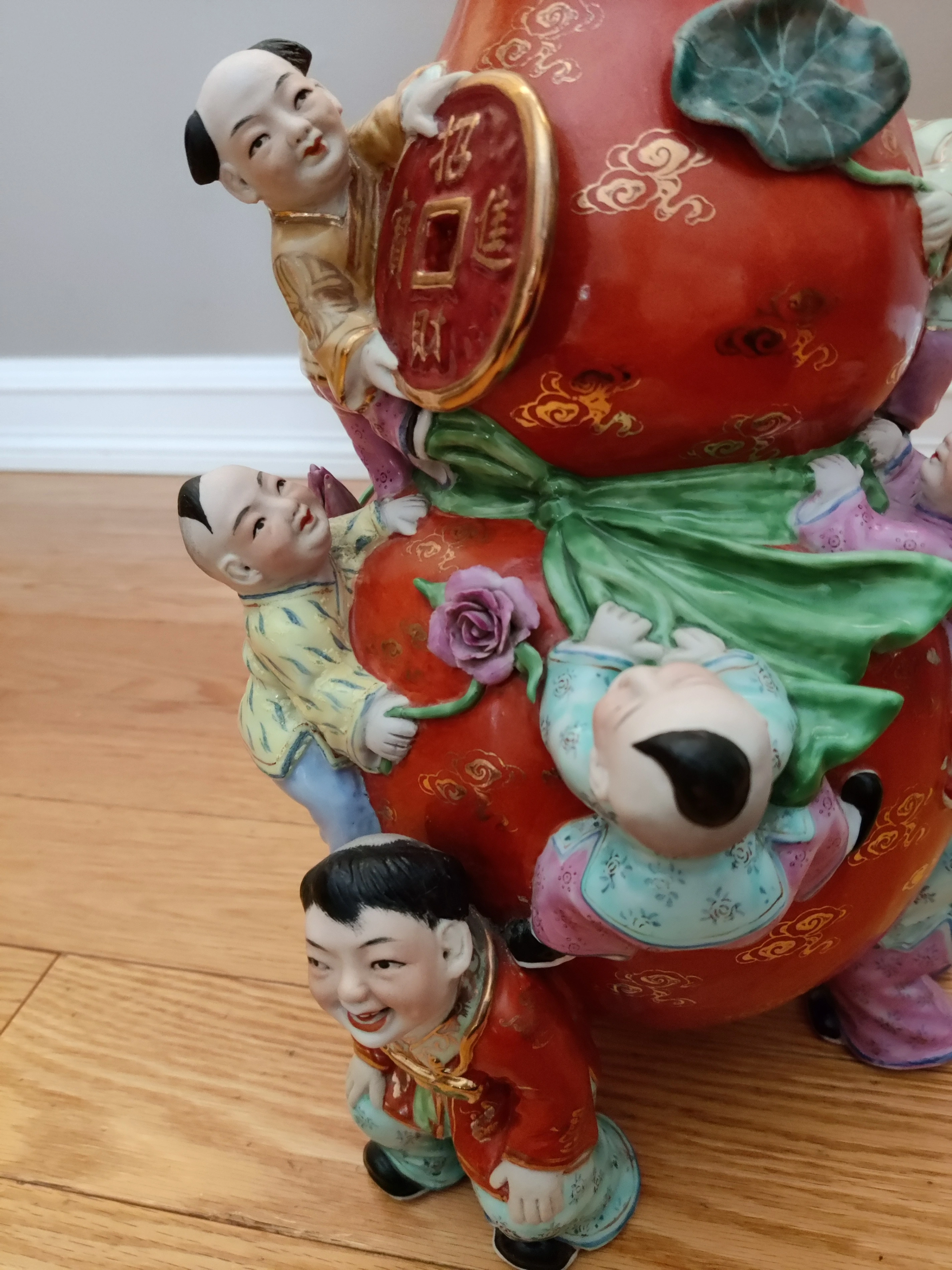 * "Coin Translation: The coin held by the child at the top features the characters 招財進寶 (Zhāo cái jìn bǎo), which literally means "Let riches and treasures come into the house.