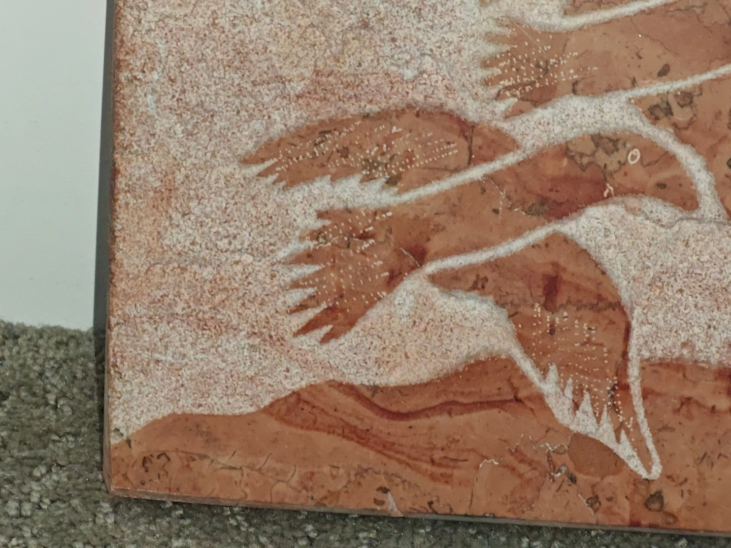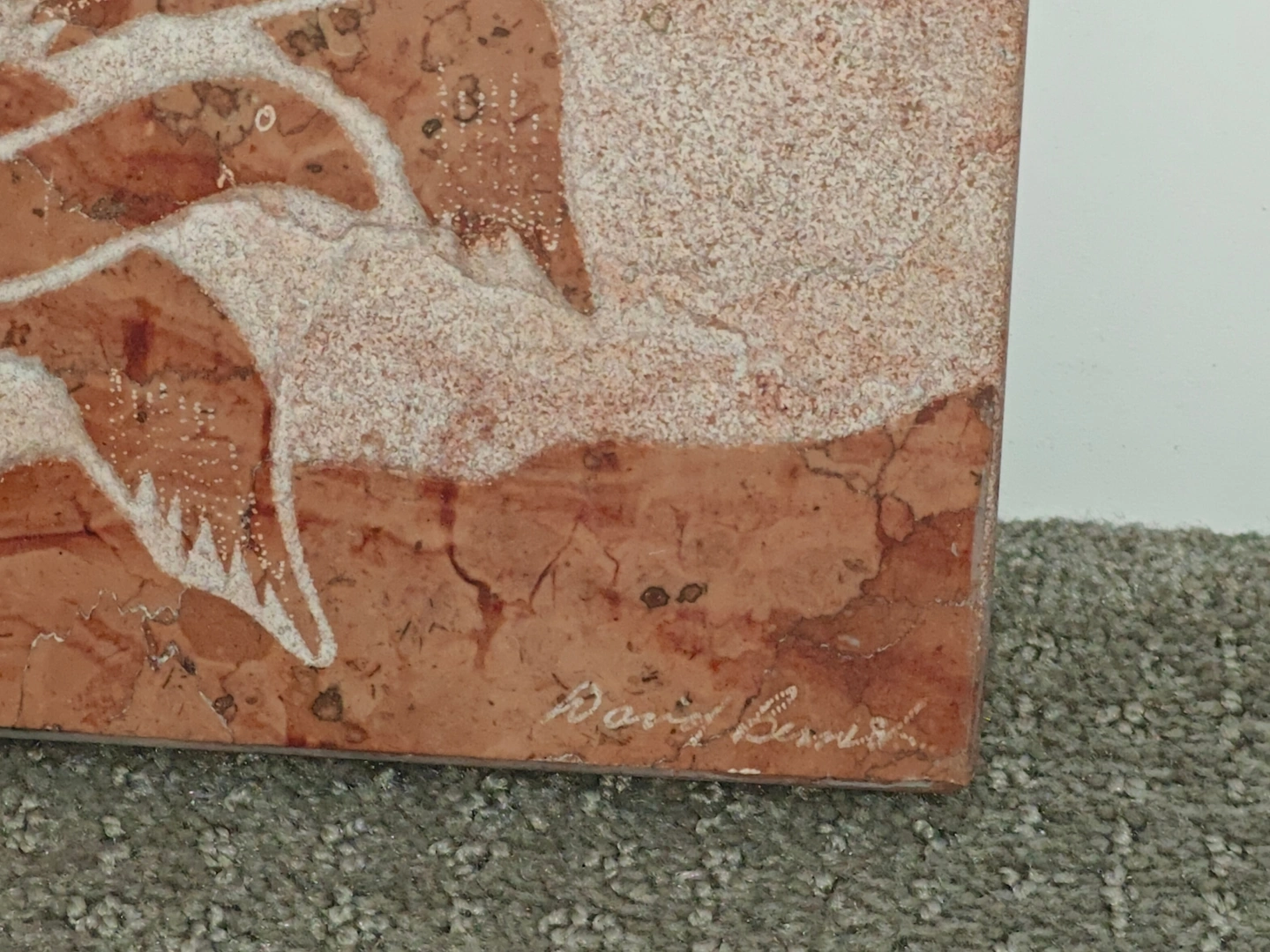 I am selling a stunning vintage marble sculpture by the acclaimed Canadian artist, David Bernett, Inuit Art Work Sculpture in excellent condition. Artwork signed by the artist. This piece, titled "Birds in Flight," is a beautiful example of his work, featuring a flock of birds gracefully carved into a piece of exquisite Rosa Verona marble.