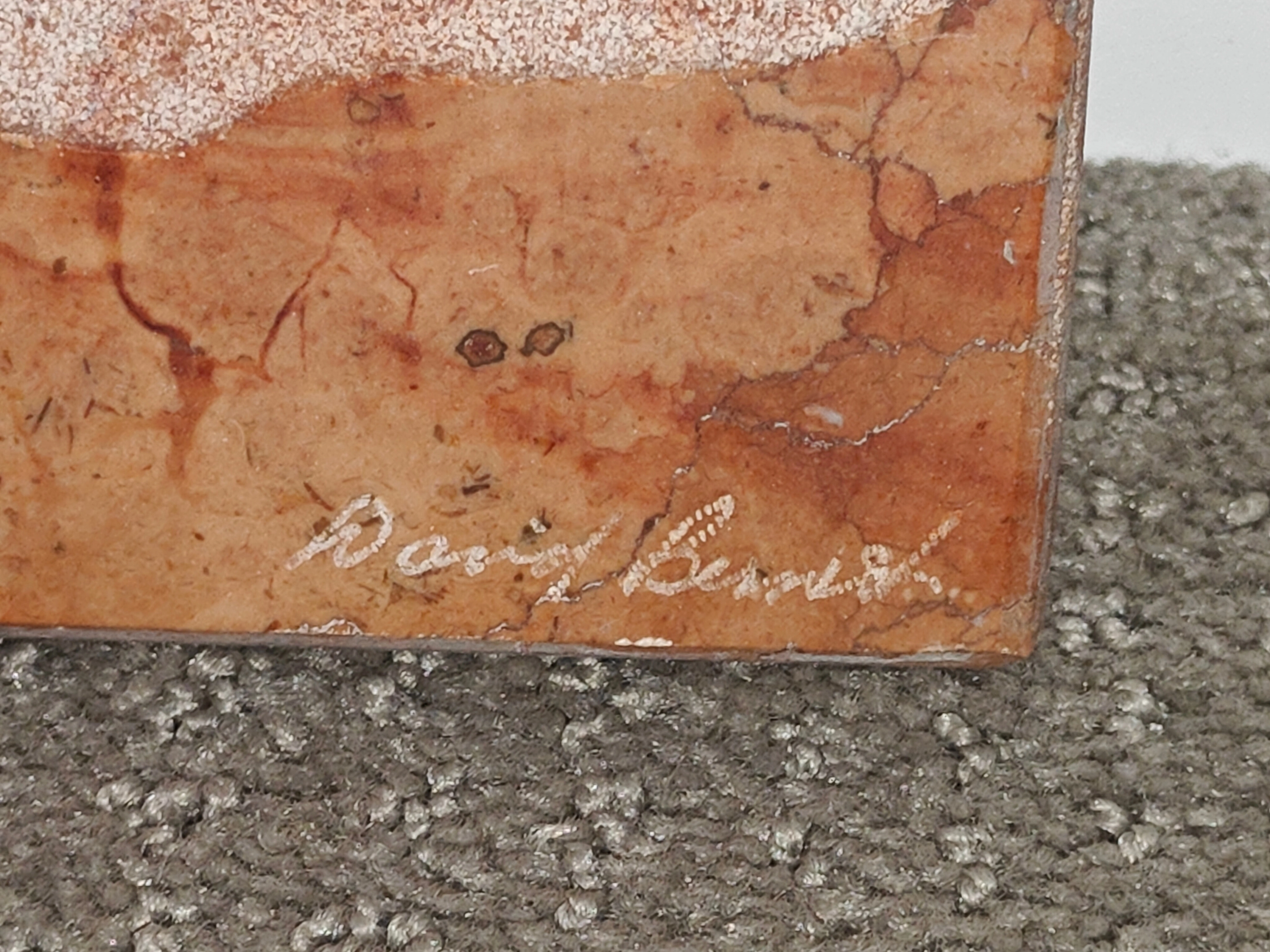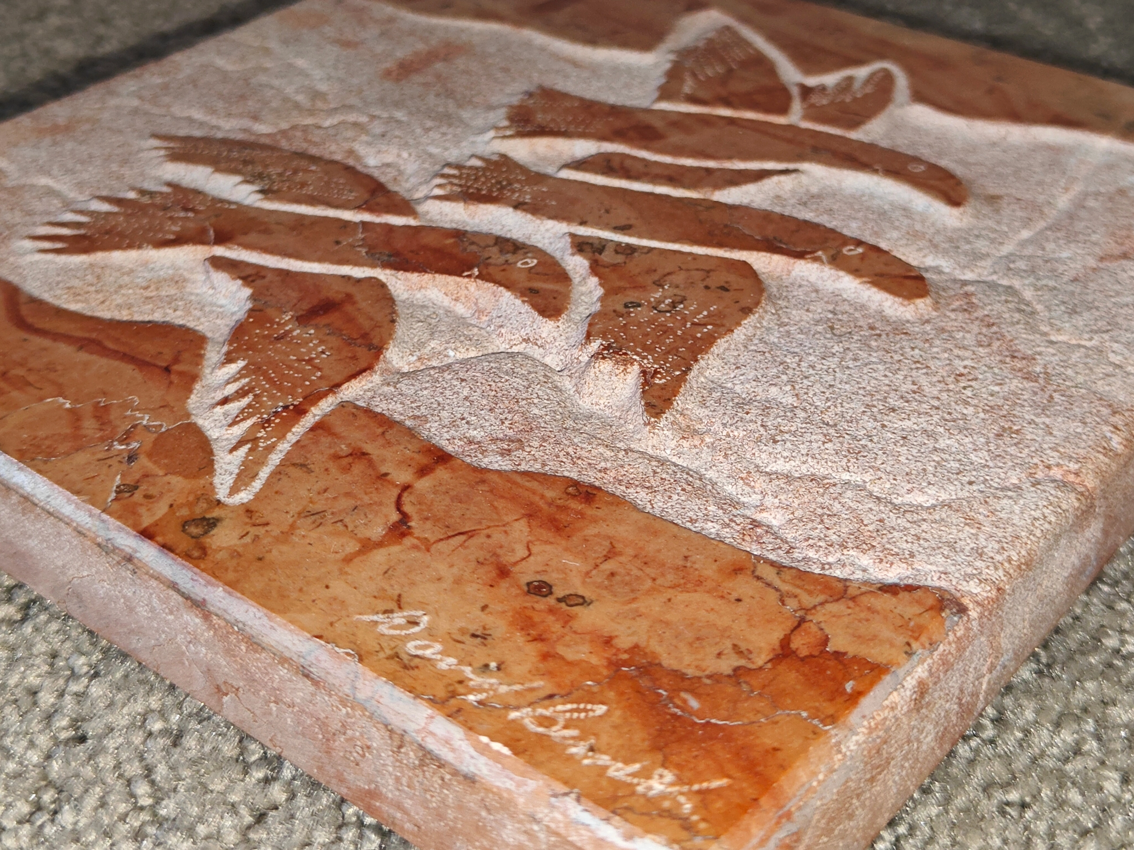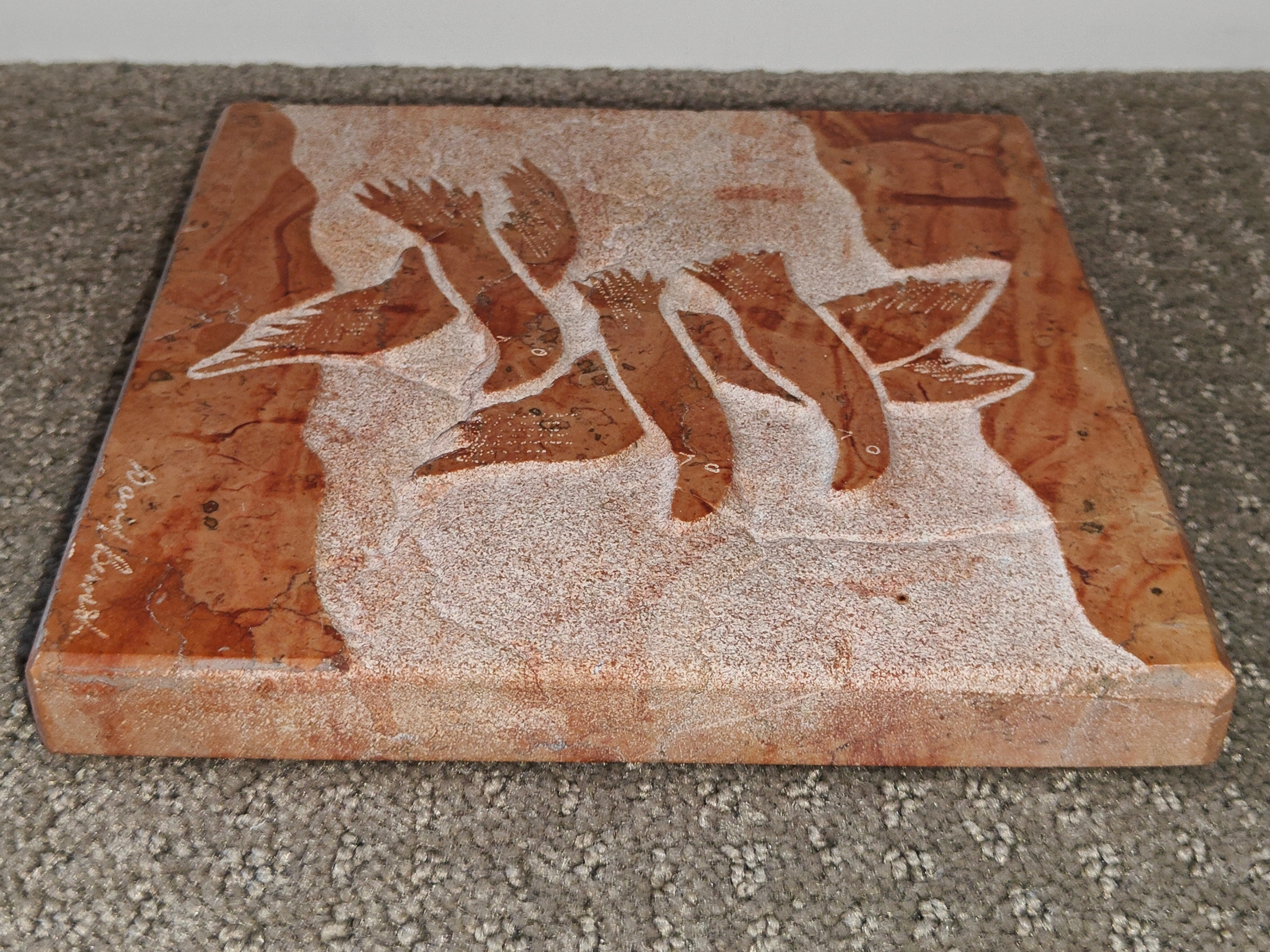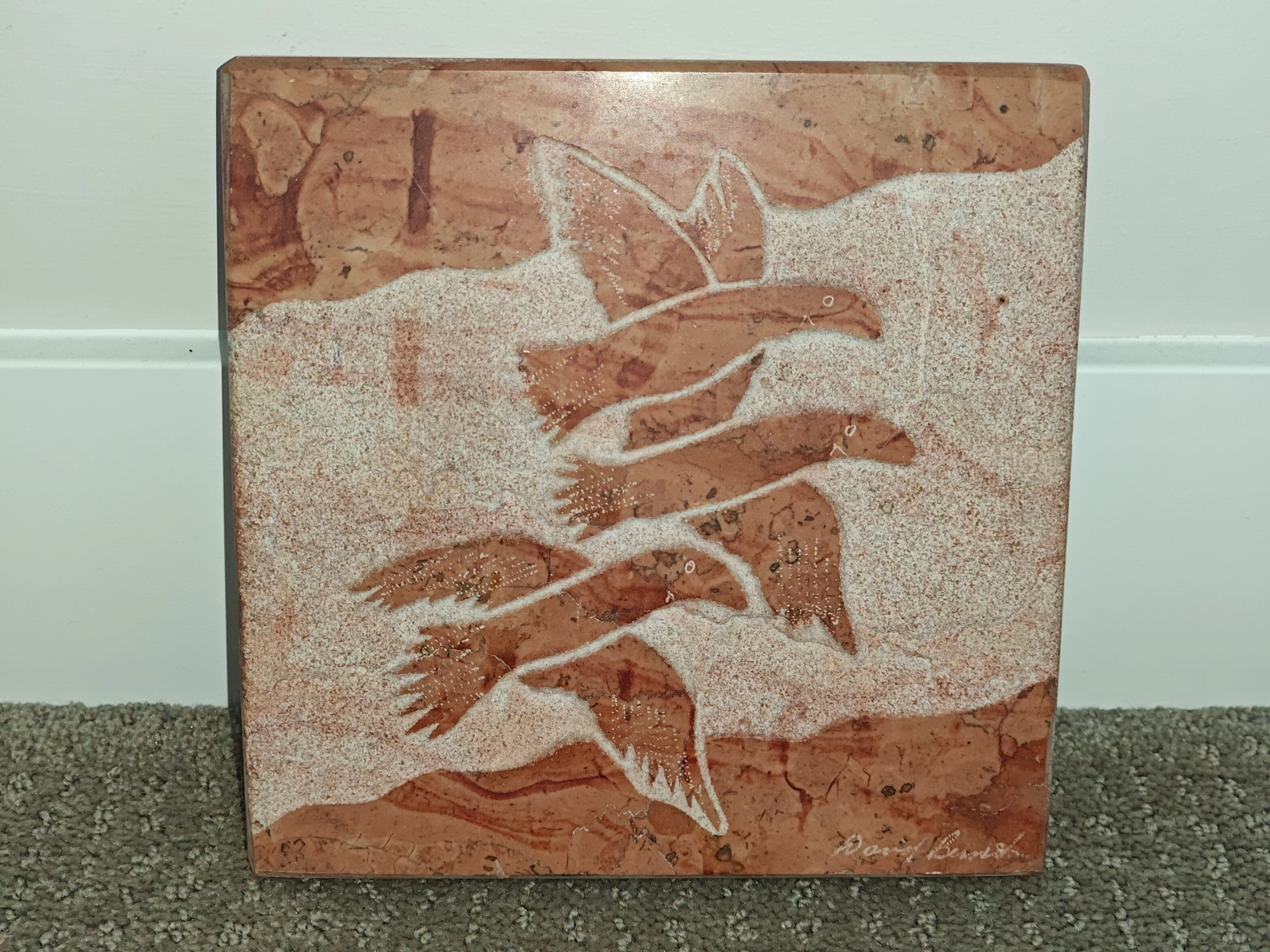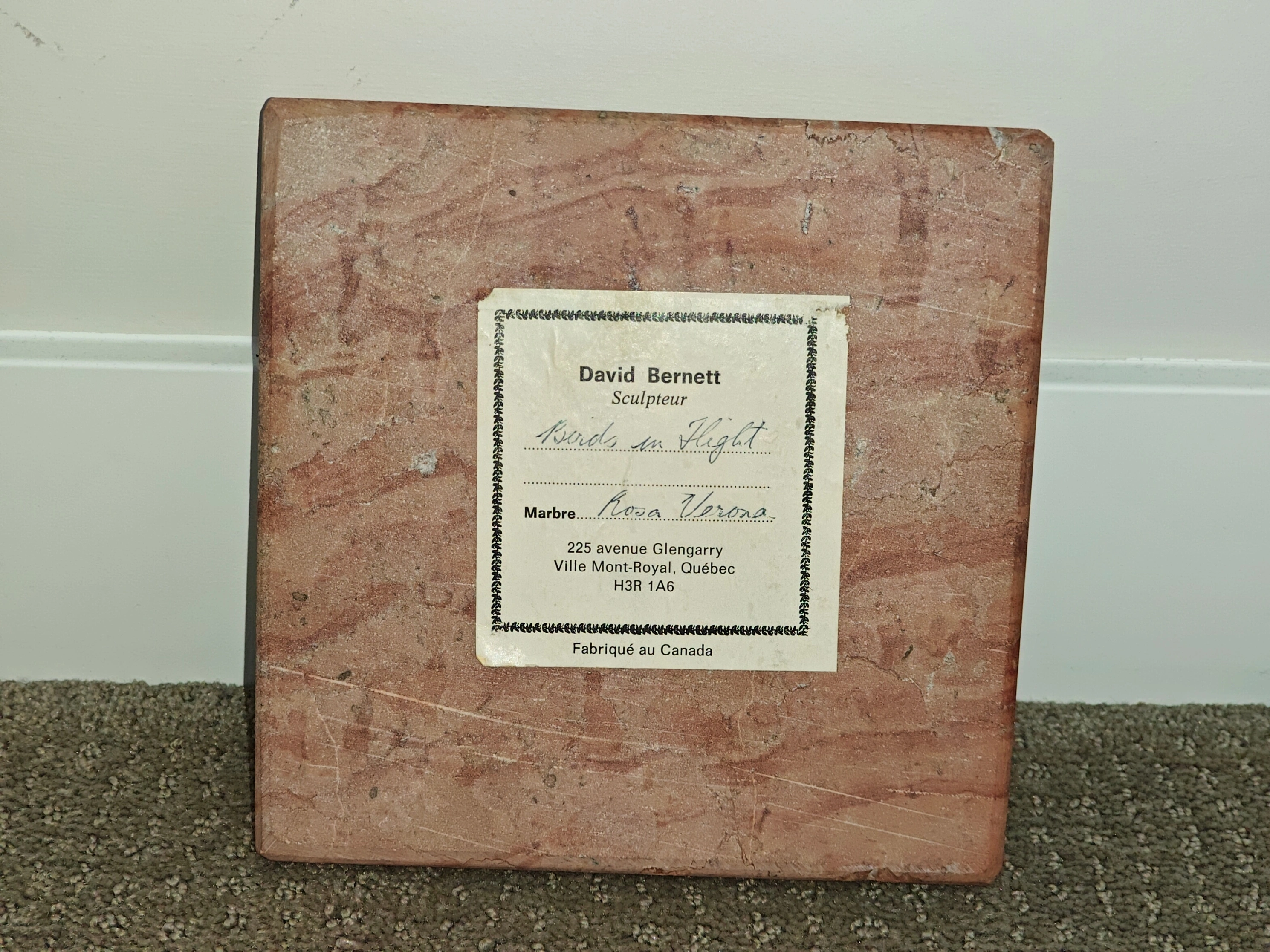 I am selling a stunning vintage marble sculpture by the acclaimed Canadian artist, David Bernett, Inuit Art Work Sculpture in excellent condition. Artwork signed by the artist. This piece, titled "Birds in Flight," is a beautiful example of his work, featuring a flock of birds gracefully carved into a piece of exquisite Rosa Verona marble.
