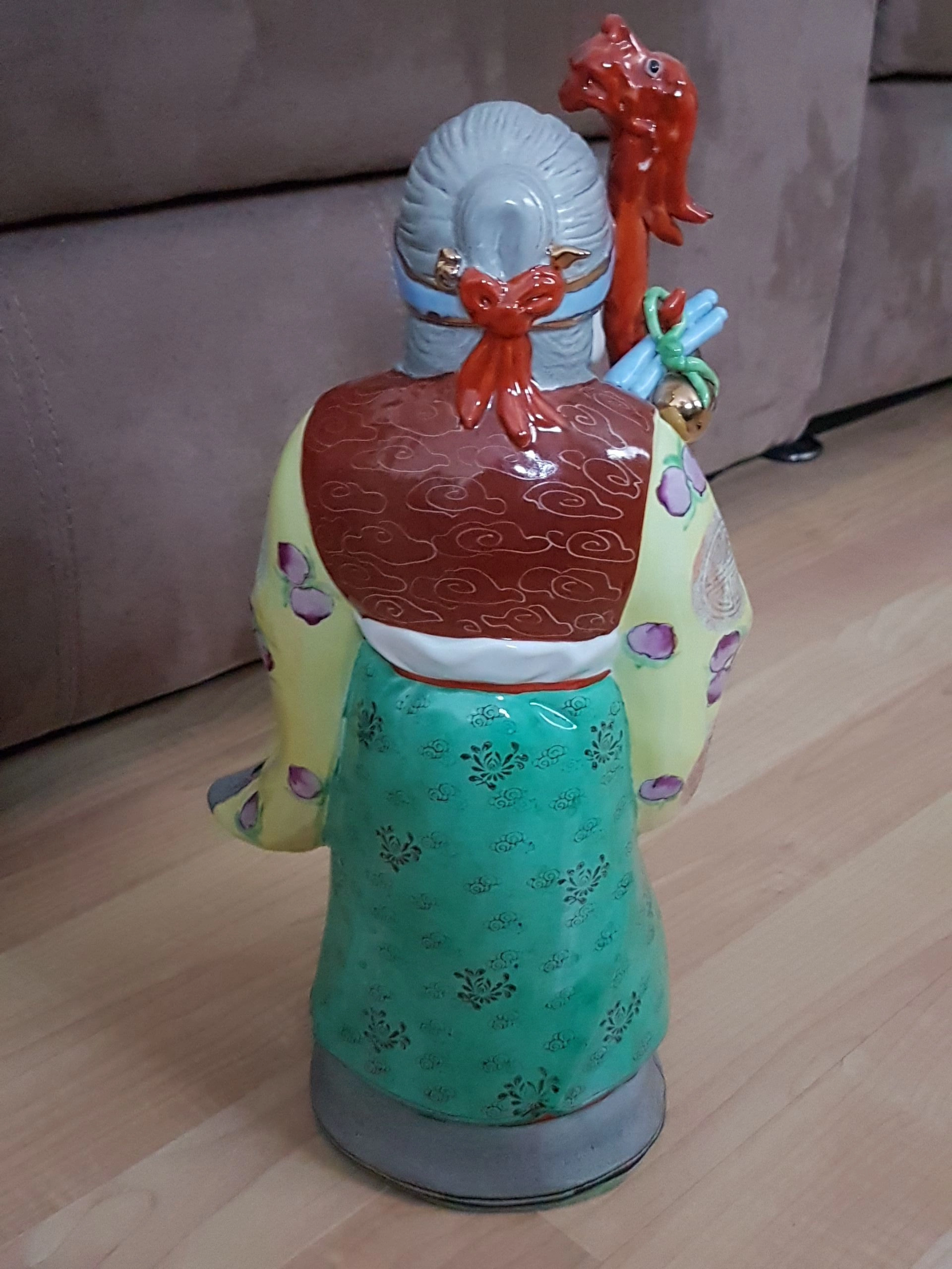 * Condition: This statue is in excellent condition, with no chips or cracks. The colors and glaze are well-preserved, showcasing the piece's history and quality. The wooden stand is also in great shape, adding to the overall value of the set.