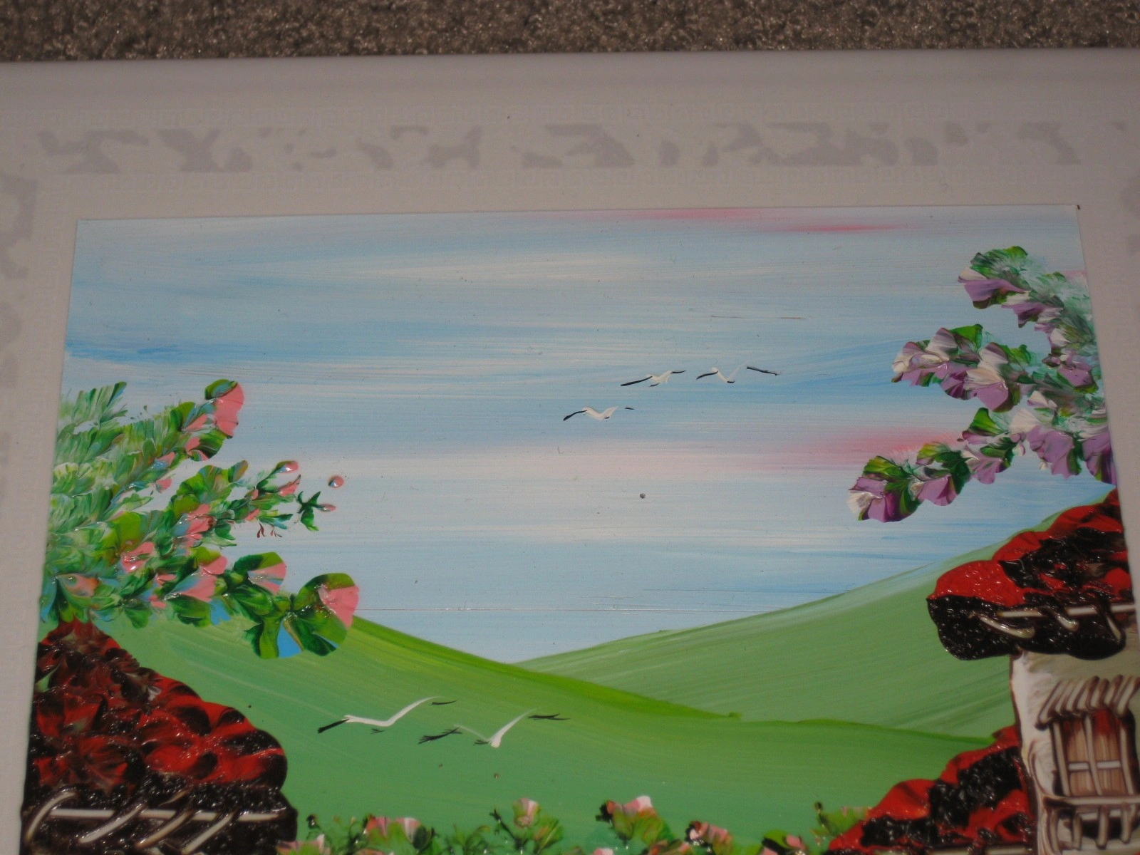 * Delicate white birds flying across the sky, adding to the peaceful ambiance.