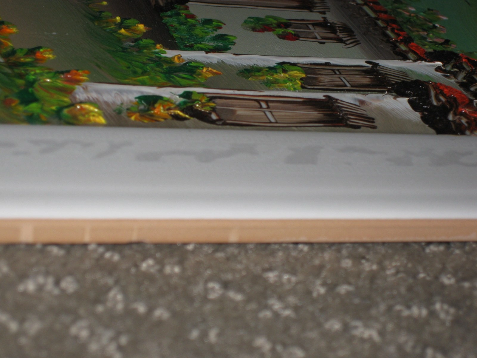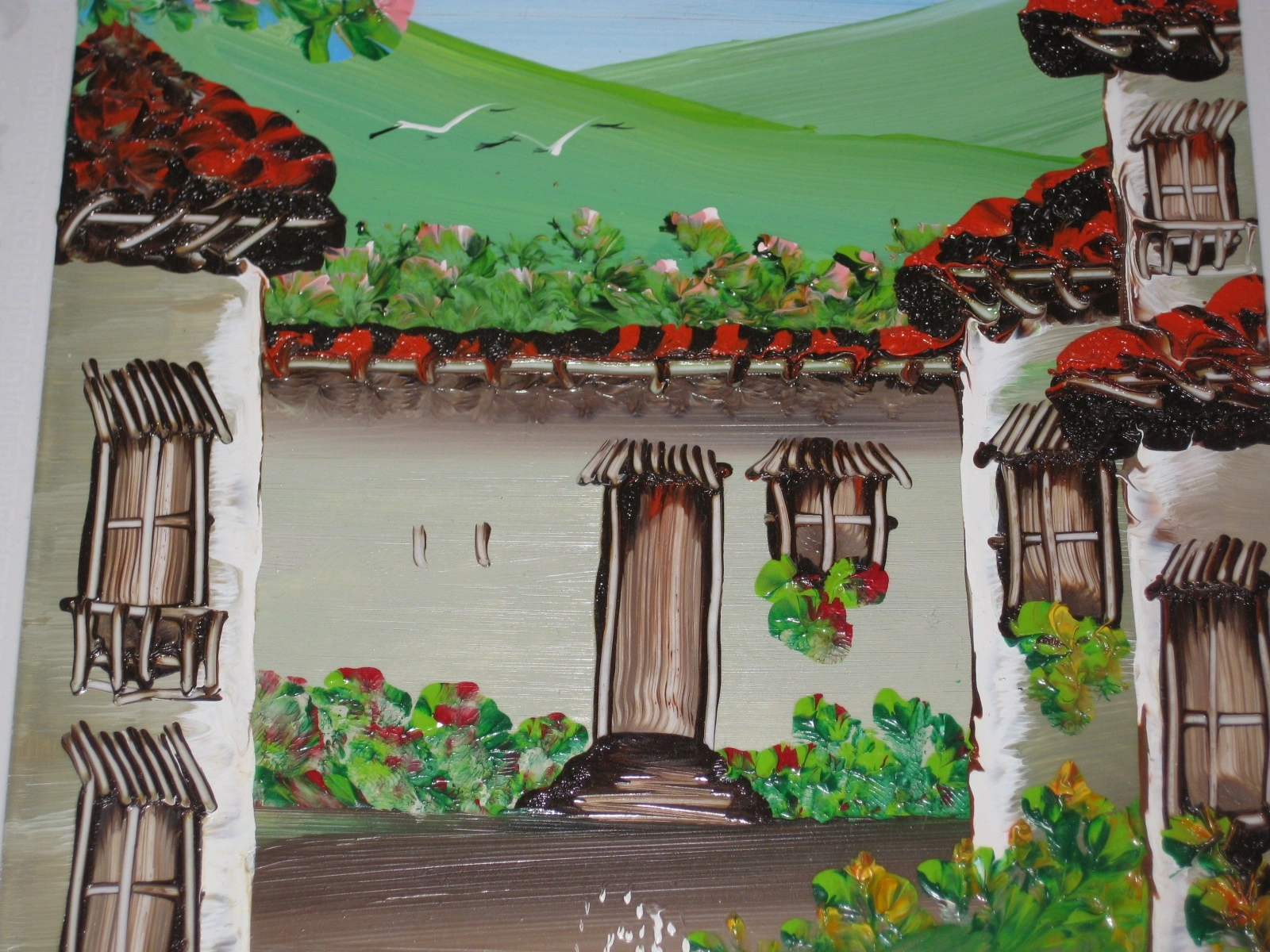 The artwork is created with a unique impasto technique, where the paint is applied in thick strokes, giving the scene a three-dimensional, textured feel. The landscape features: