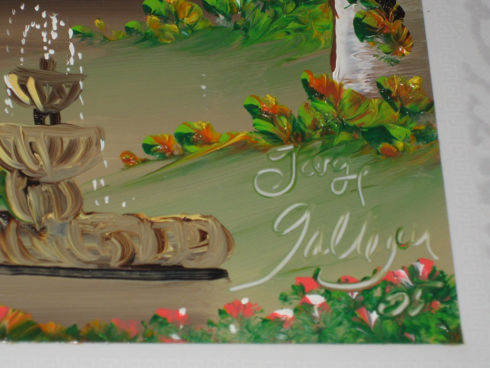 * A central water fountain with flowing water depicted in raised paint.