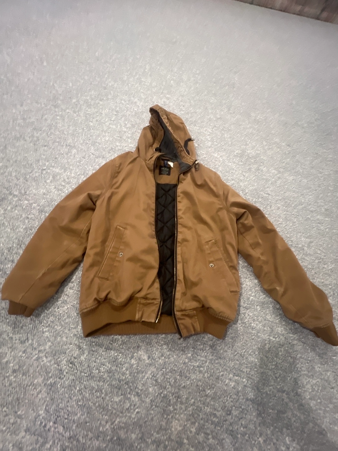 Here's a brown hooded jacket from H&M. It's in good condition and perfect for cool weather. The jacket features a quilted lining and a zip-up front.