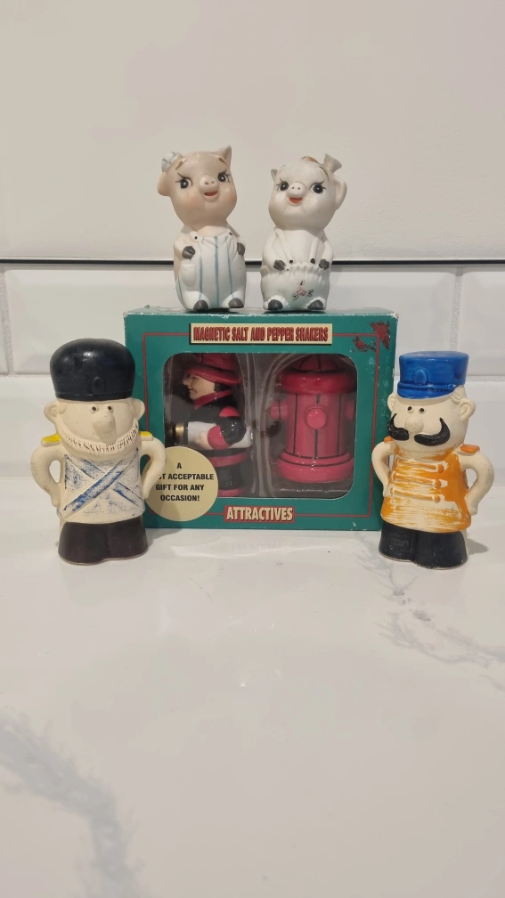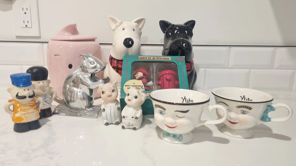 109Selling a collection of adorable cookie jars x3! salt n pepper collectibe x 3, nut cracker, vintage cups x2...
