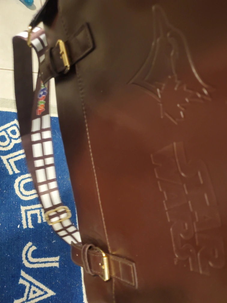 83Check out this cool Star Wars messenger bag! It's a stylish brown leather bag with the Star Wars logo embossed on the front. Perfect for carrying your books or laptop while showing off your love for the galaxy far, far away Never been used