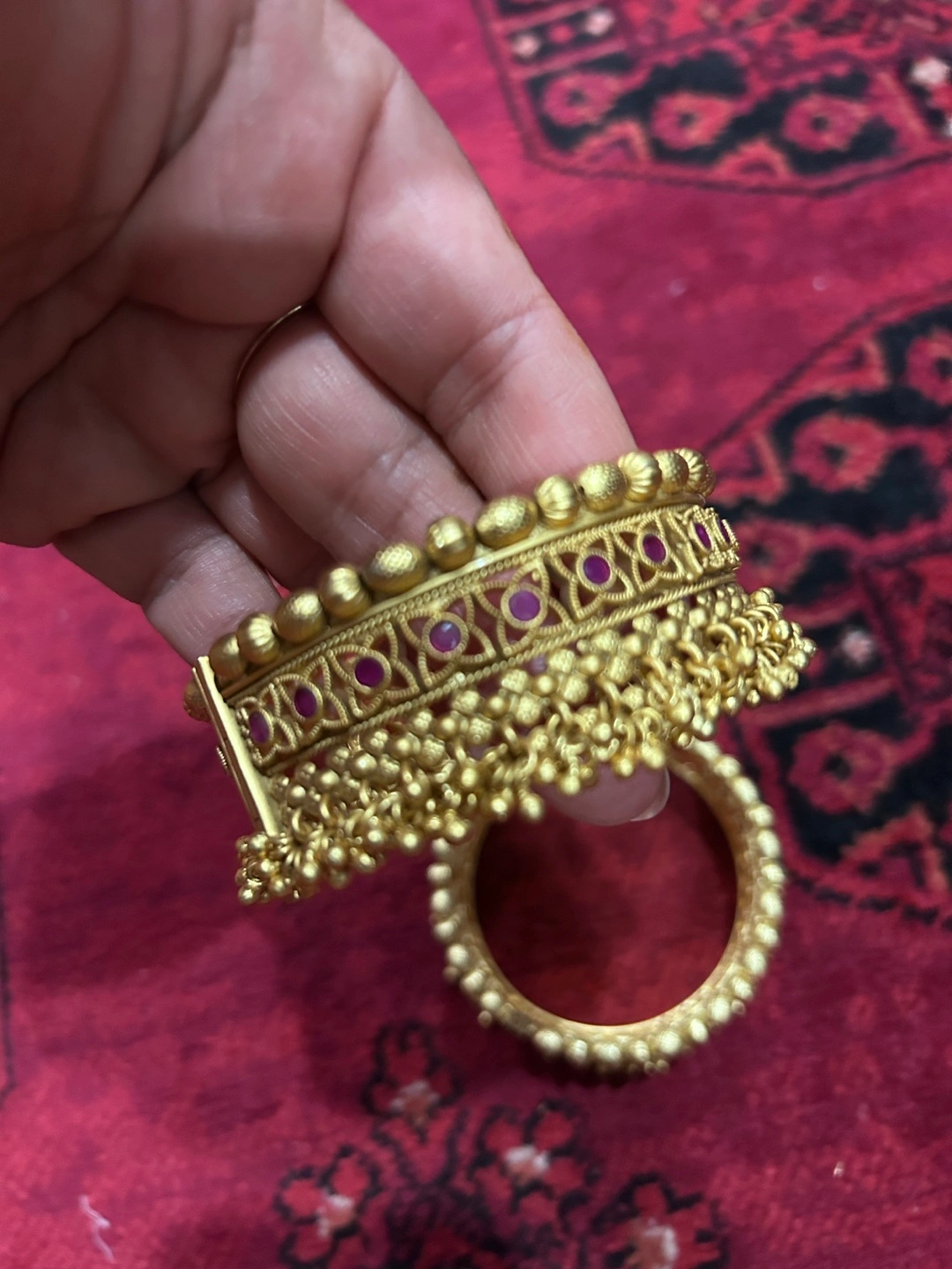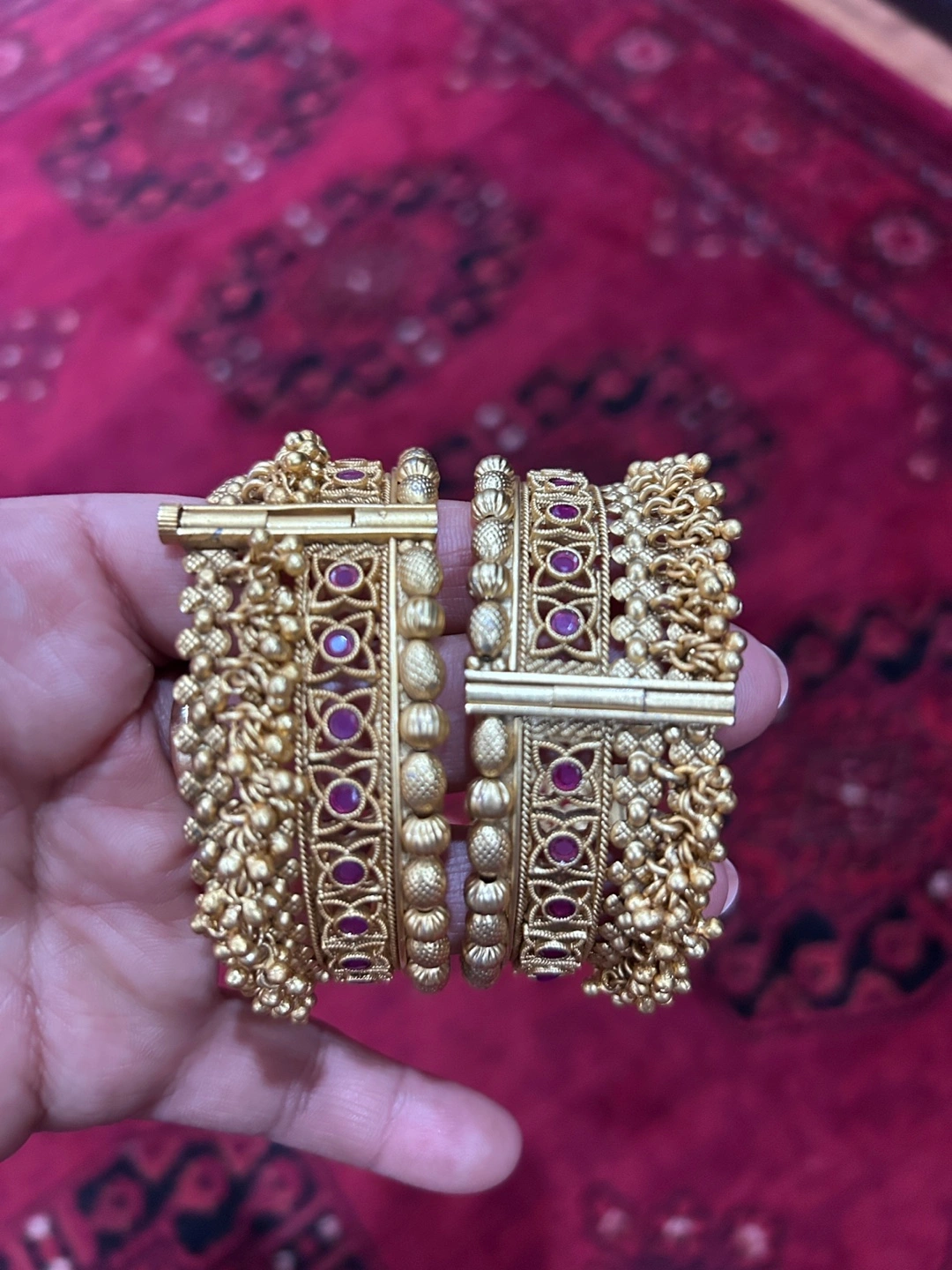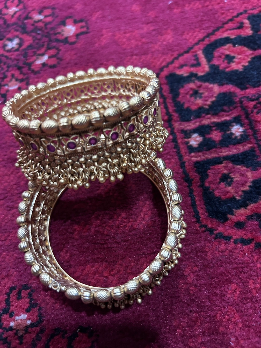 Selling a set of gold-tone bangles. They have a beautiful design with small decorative details and red stones. Would be a lovely addition to your jewellery collection!