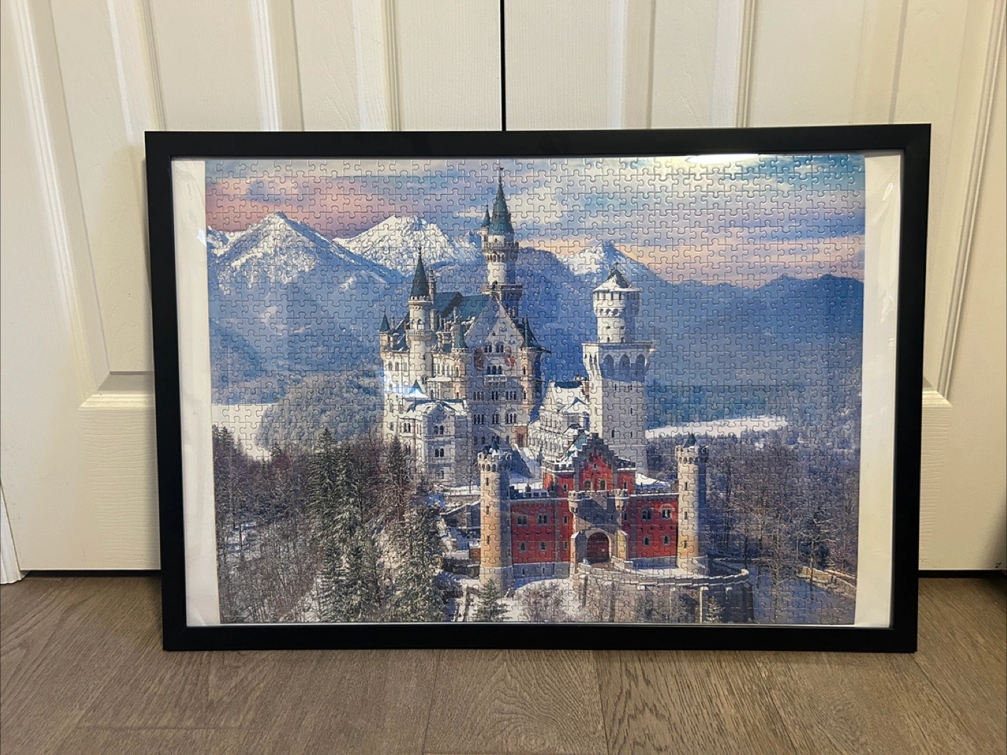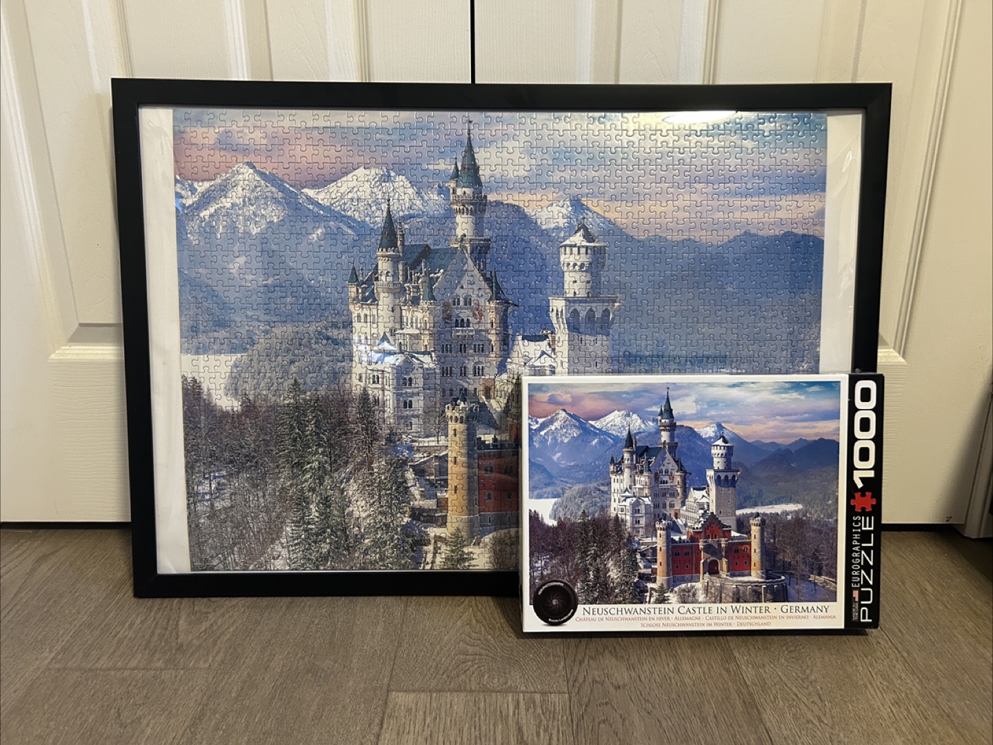 Selling a framed 1000-piece puzzle of Neuschwanstein Castle in Winter. It's a beautiful image of the famous castle in Germany. The completed puzzle is framed and ready to hang. Not glued together, can easily be taken apart and put together again. Come with the original box.