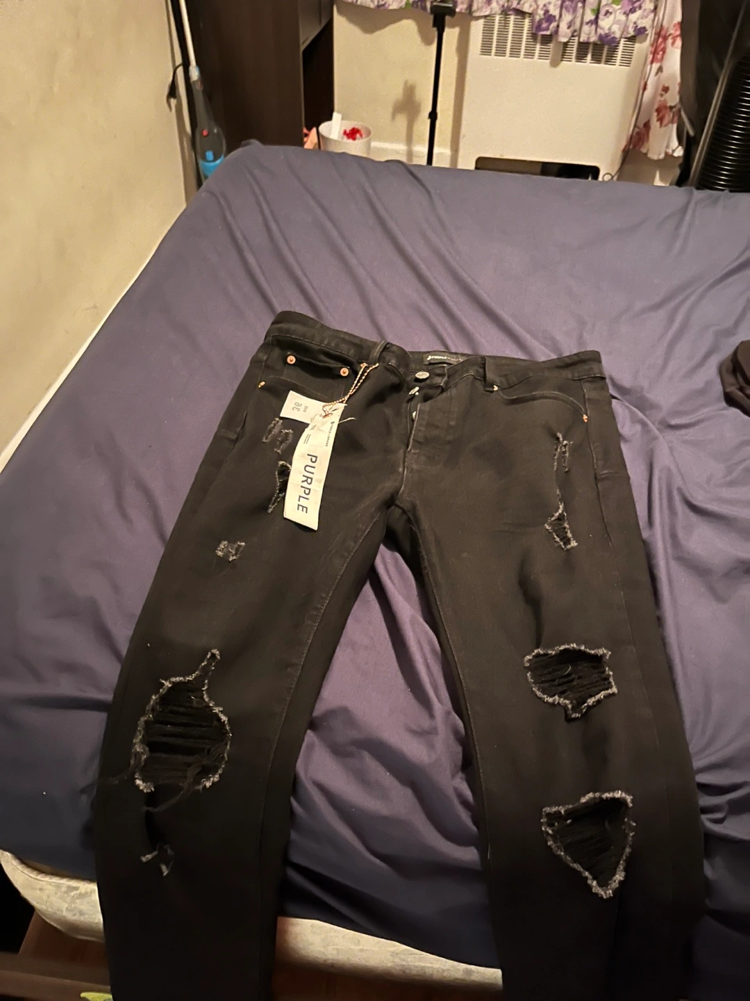 Selling a pair of Purple Brand jeans in black. They feature a cool distressed look. They're in great condition and ready for a new home!