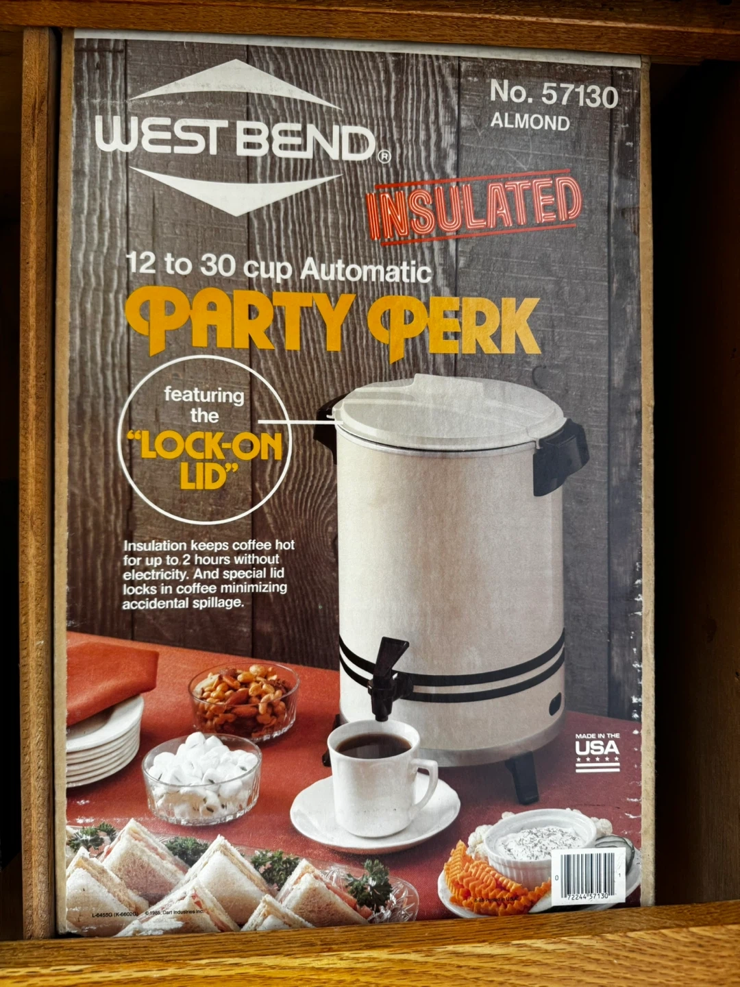 Selling a West Bend Party Perk automatic coffee urn! It's insulated and can hold 12 to 30 cups. The "Lock-On Lid" is a great feature to minimize spills. It keeps coffee hot for up to 2 hours without electricity