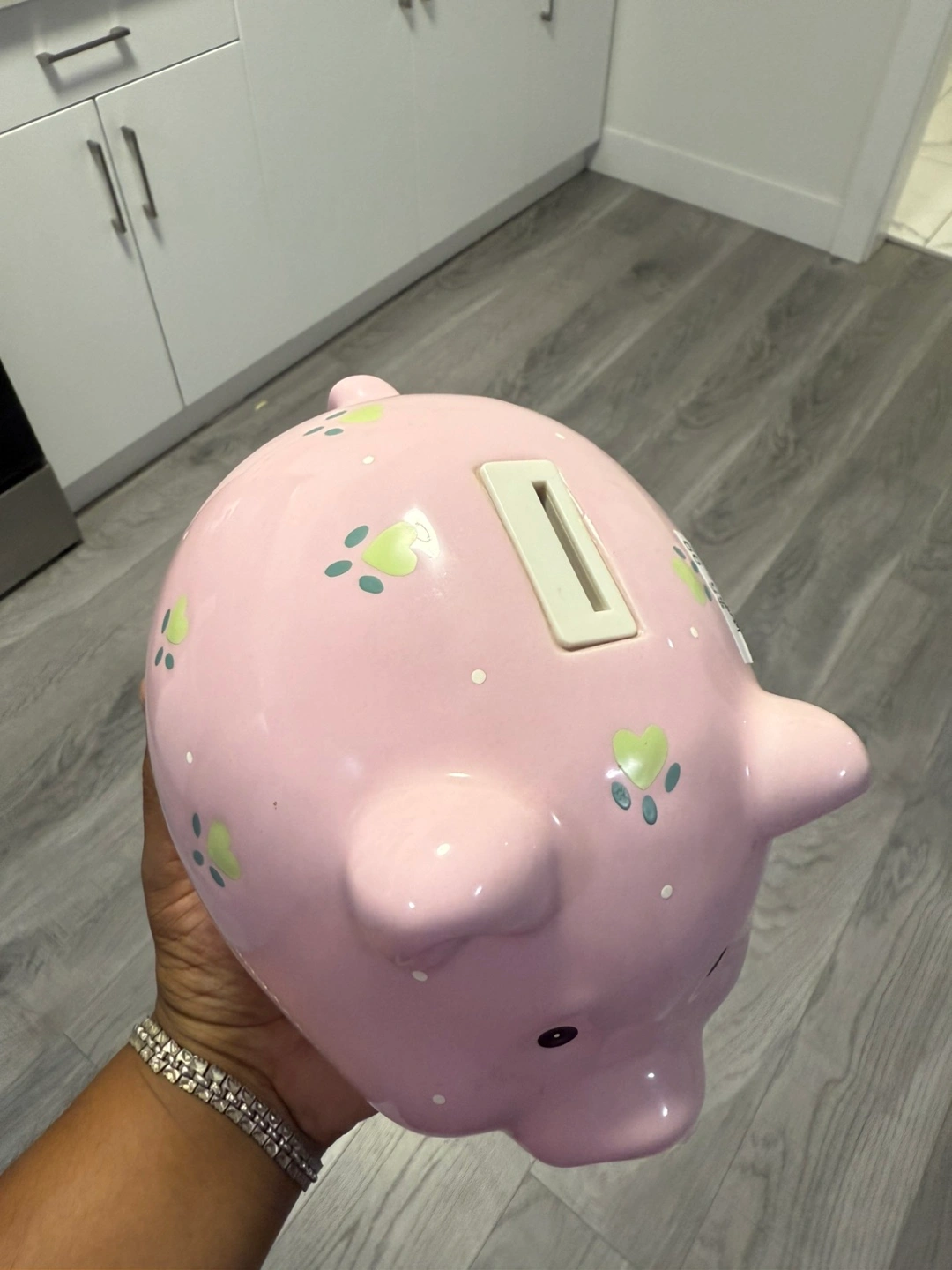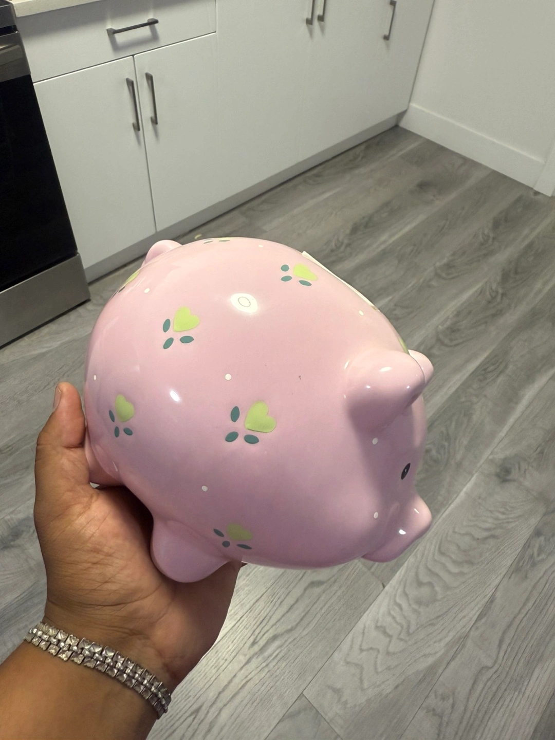 Selling a cute pink piggy bank! It has little green floral designs and a coin slot on top. It's in great shape and ready to help you save up!