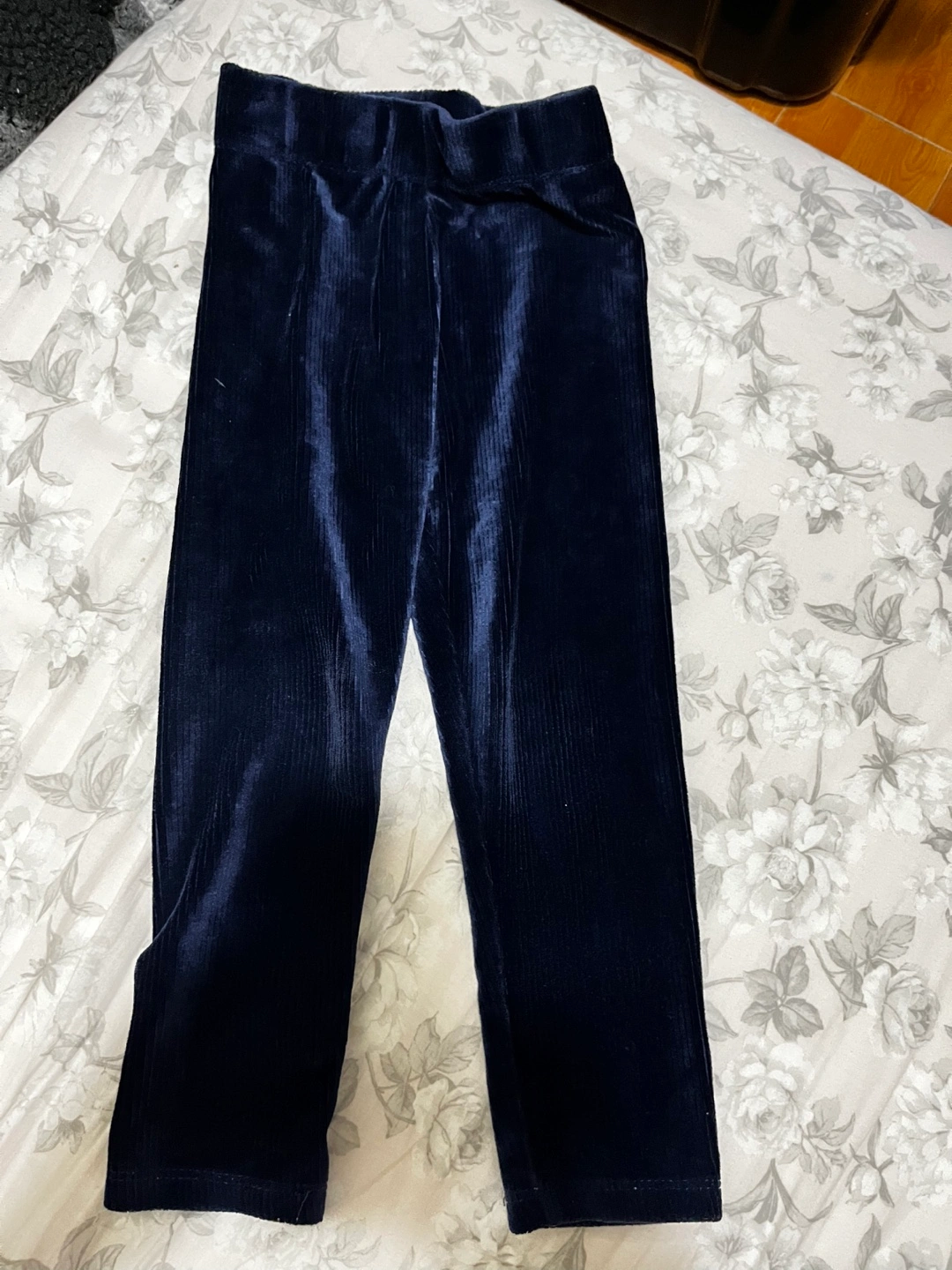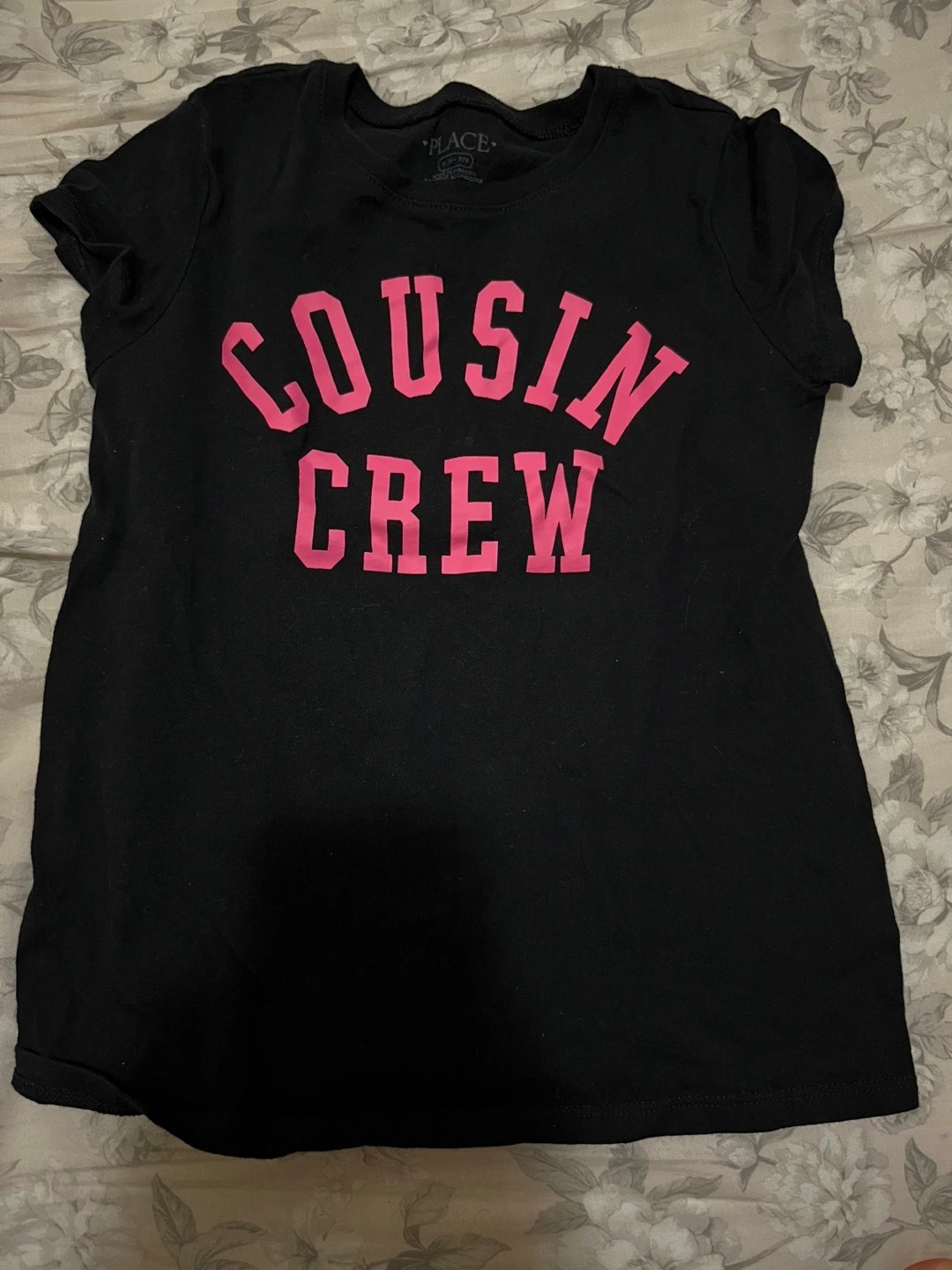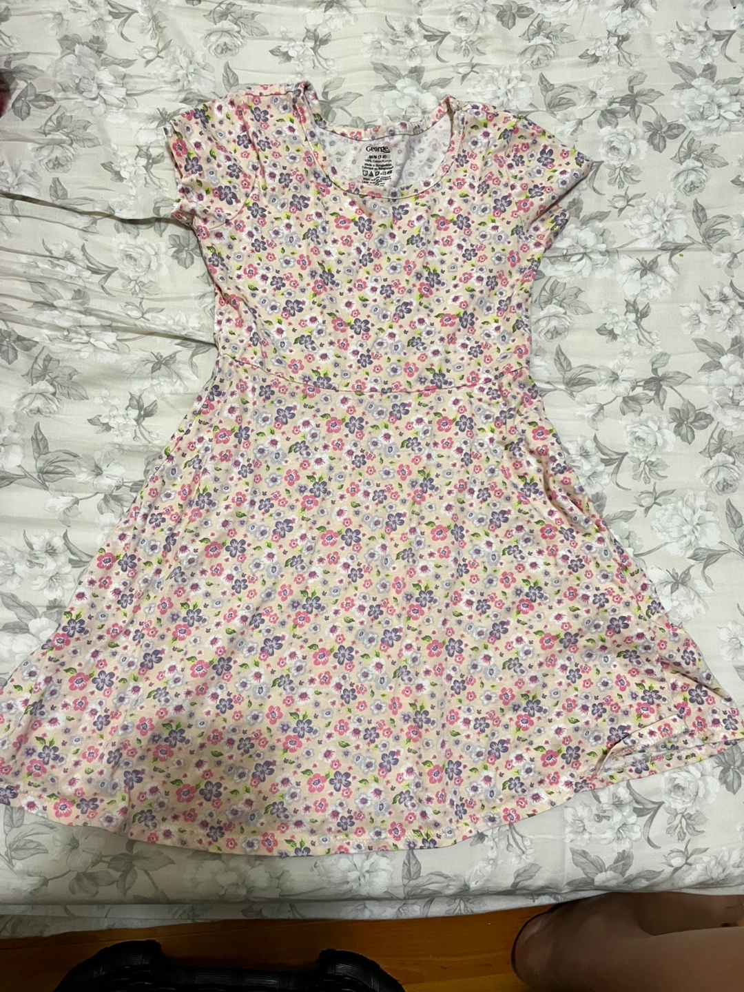 Selling a bundle of girls' clothing! Includes a pink floral swimsuit, two dresses (one floral, one purple with hearts), a black 'Cousin Crew' t-shirt, and blue leggings with Mickey Mouse designs. All items are in gently used condition and ready for a new home