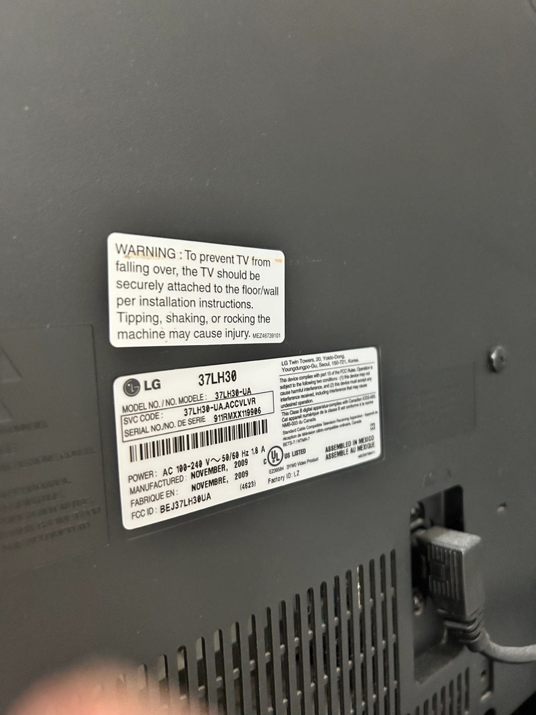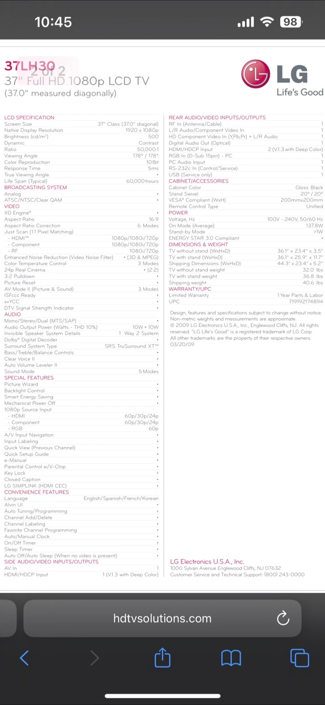 Selling a used LG 37LH30 37" Full HD 1080p LCD TV. It's in good working condition with no defects. Please note this is not a smart TV.