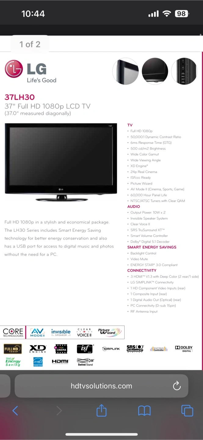 Selling a used LG 37LH30 37" Full HD 1080p LCD TV. It's in good working condition with no defects. Please note this is not a smart TV.